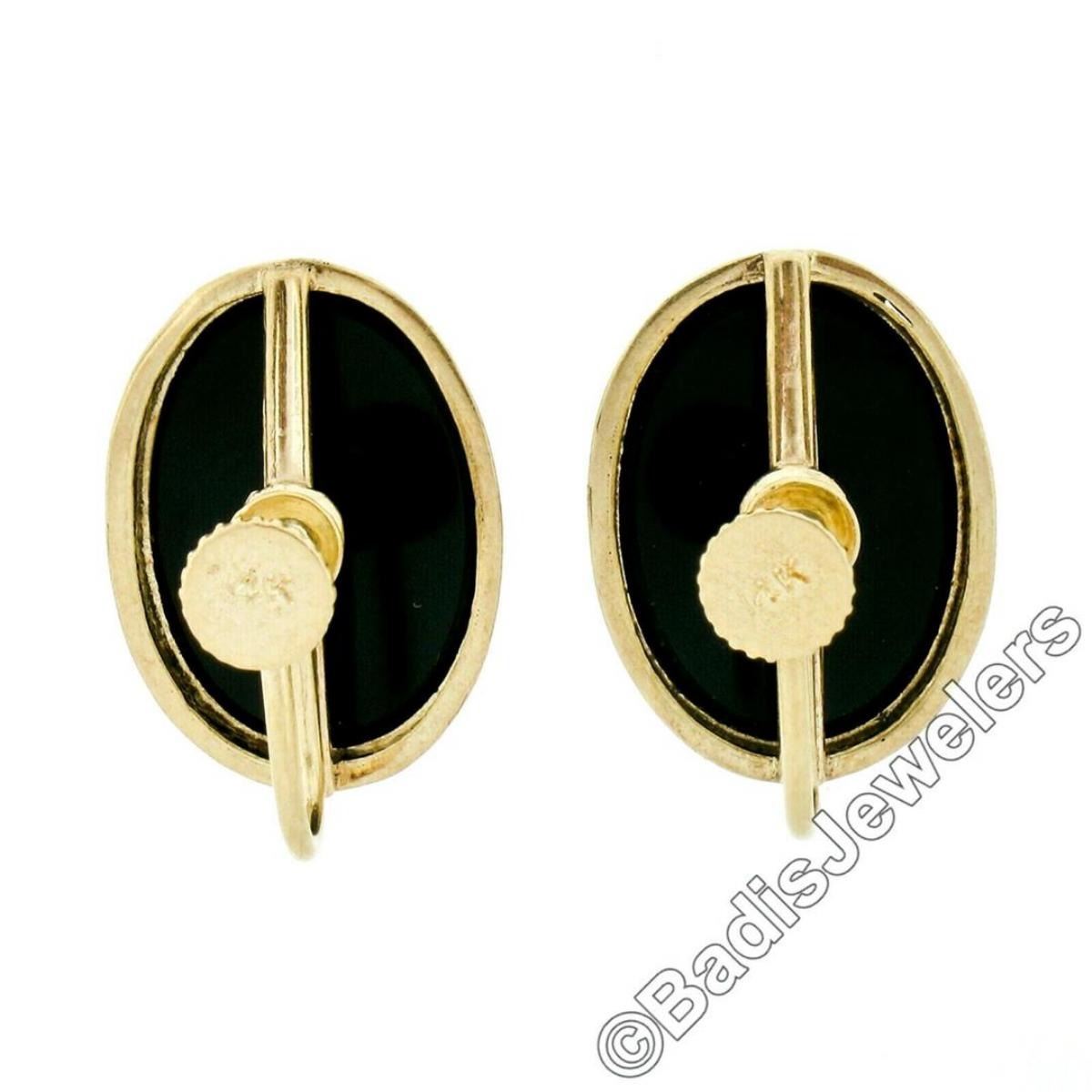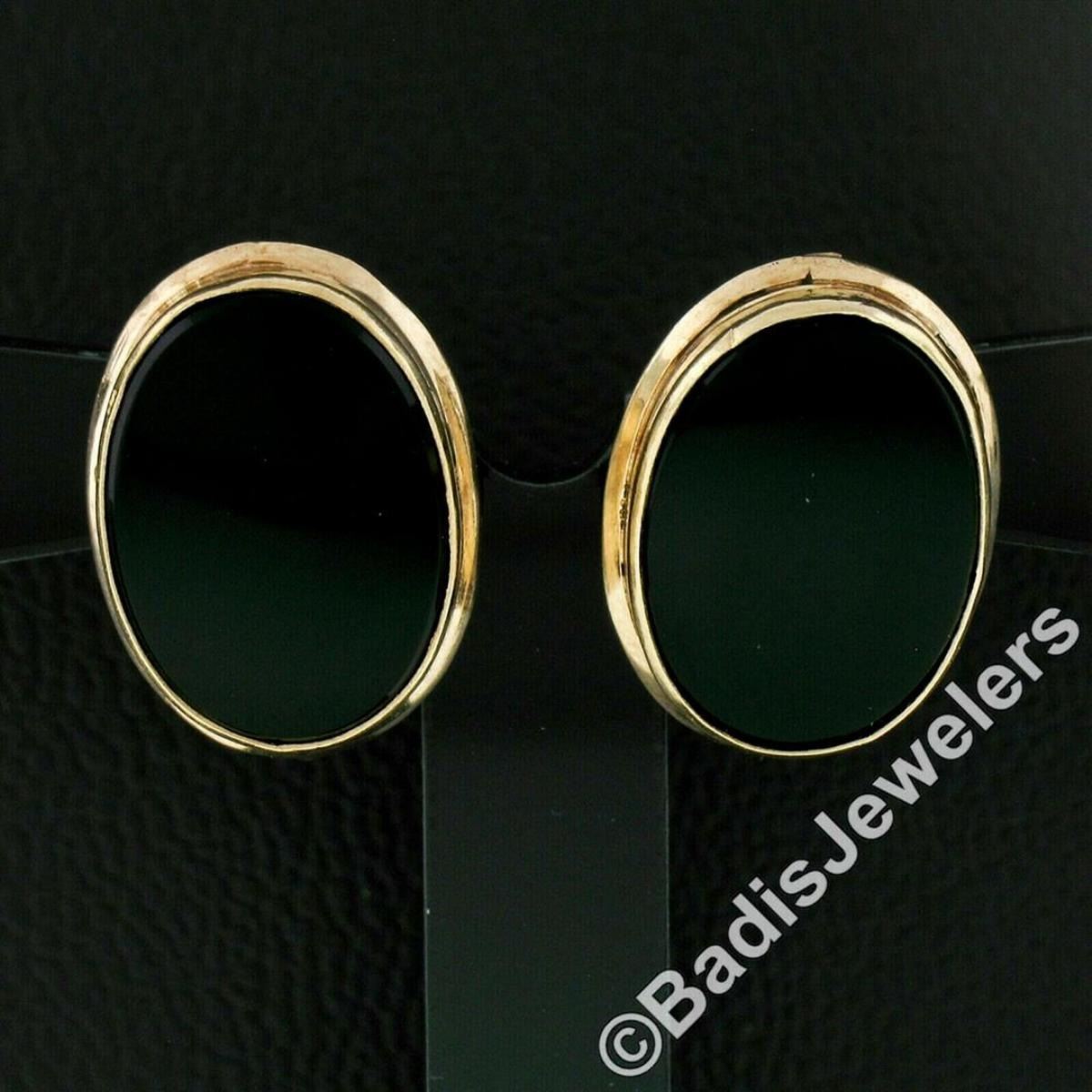 A pair of vintage 14kt yellow gold button earrings featuring a pair of oval cabochon black onyx stones (15.85x11.85mm). The earrings measure approximately 19.50x13.85mm and weigh a total of 4.60 grams.