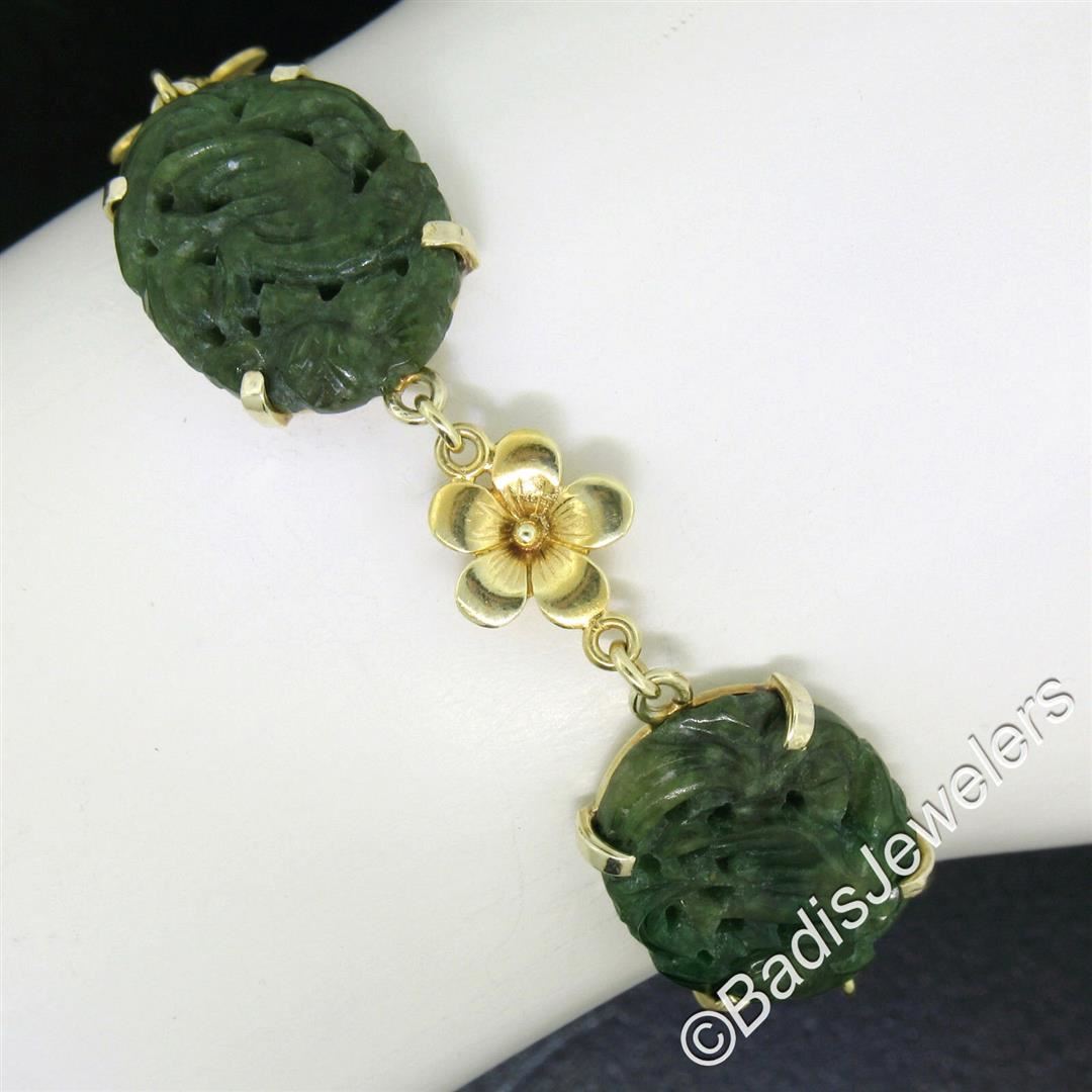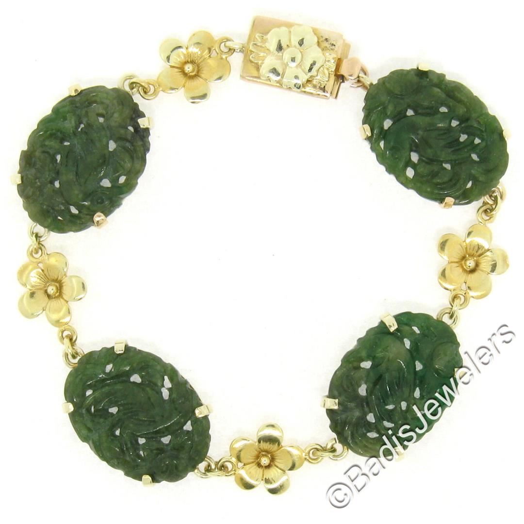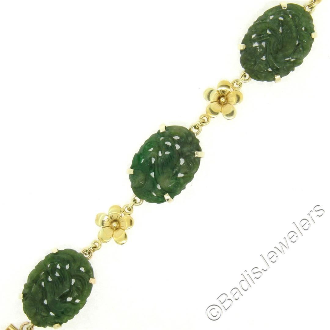 A vintage 14kt yellow gold carved 18.9x13.9mm oval jade and etched flower link bracelet. It weighs a total of 12.2 grams, measures 8.9mm wide, and measures 6.25 inches in length.