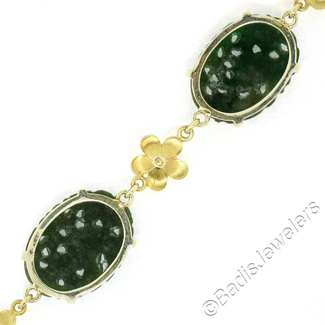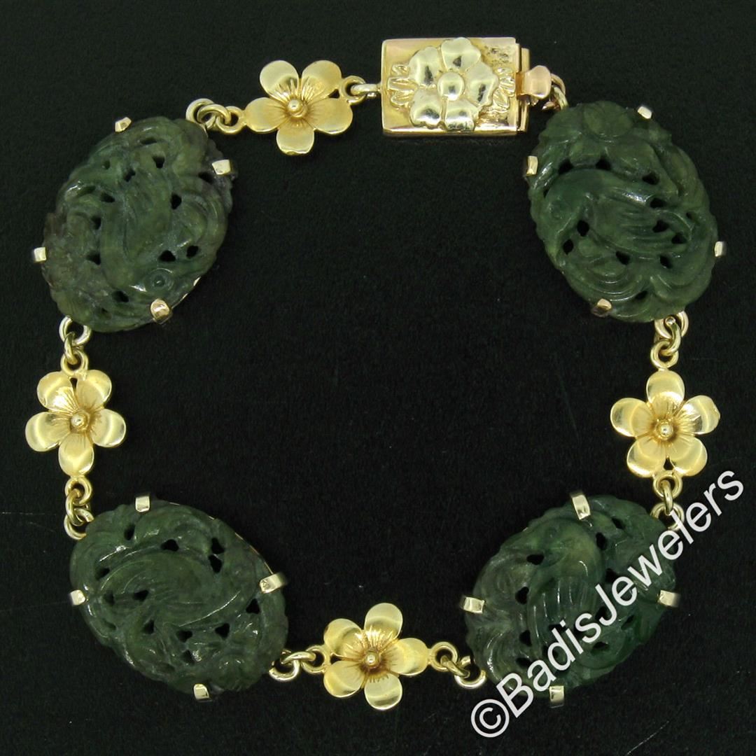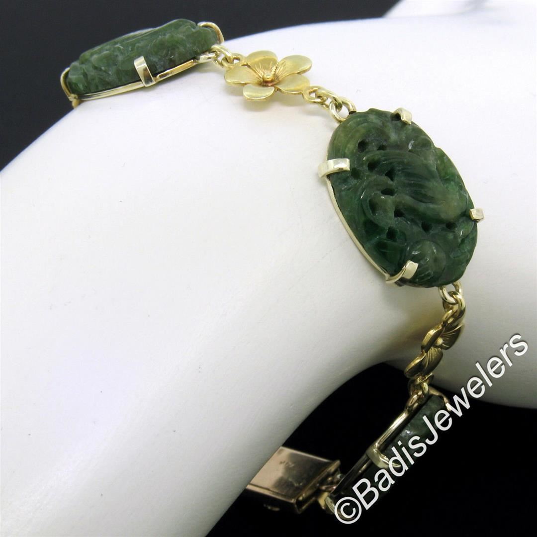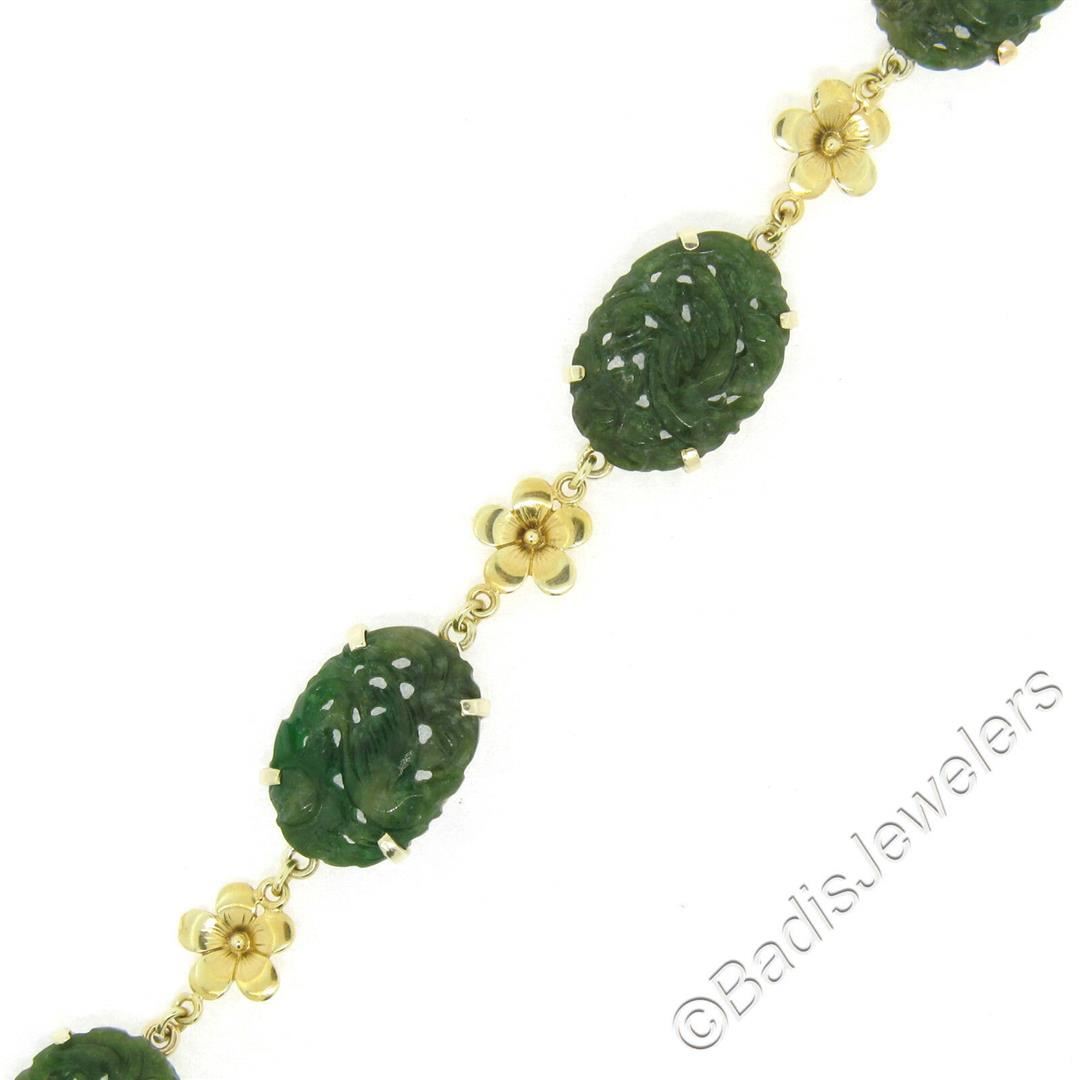 A vintage 14kt yellow gold carved 18.9x13.9mm oval jade and etched flower link bracelet. It weighs a total of 12.2 grams, measures 8.9mm wide, and measures 6.25 inches in length.
