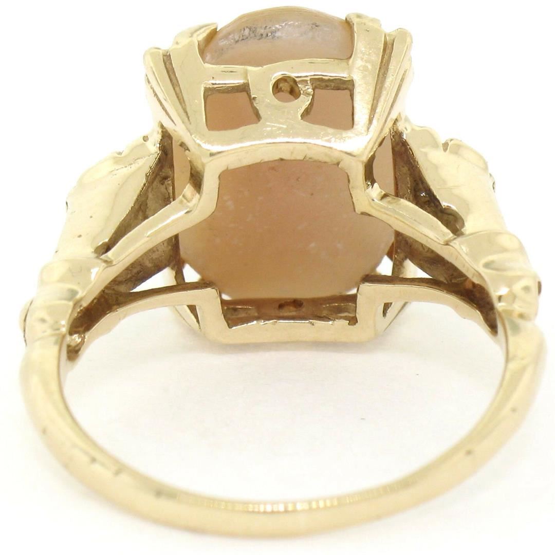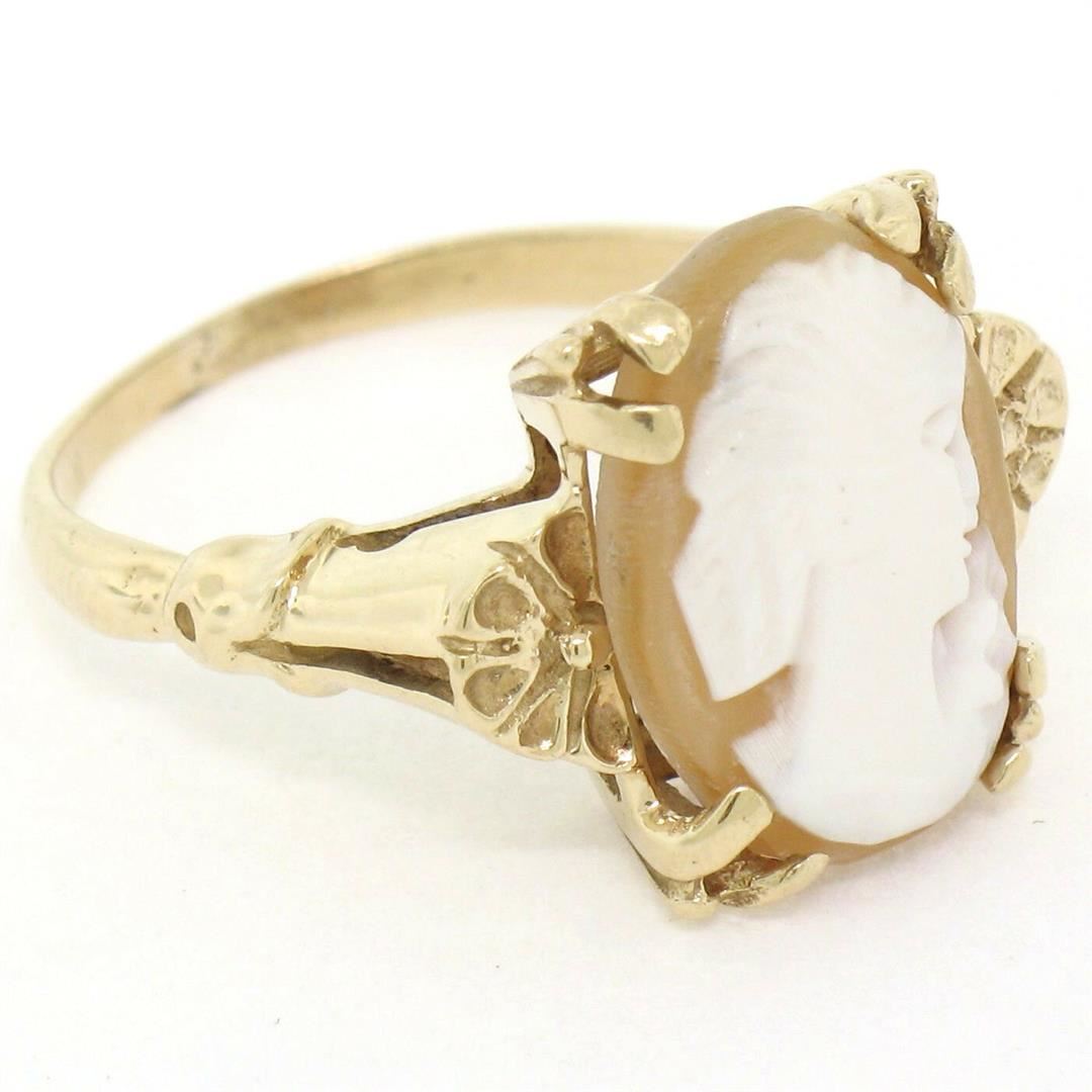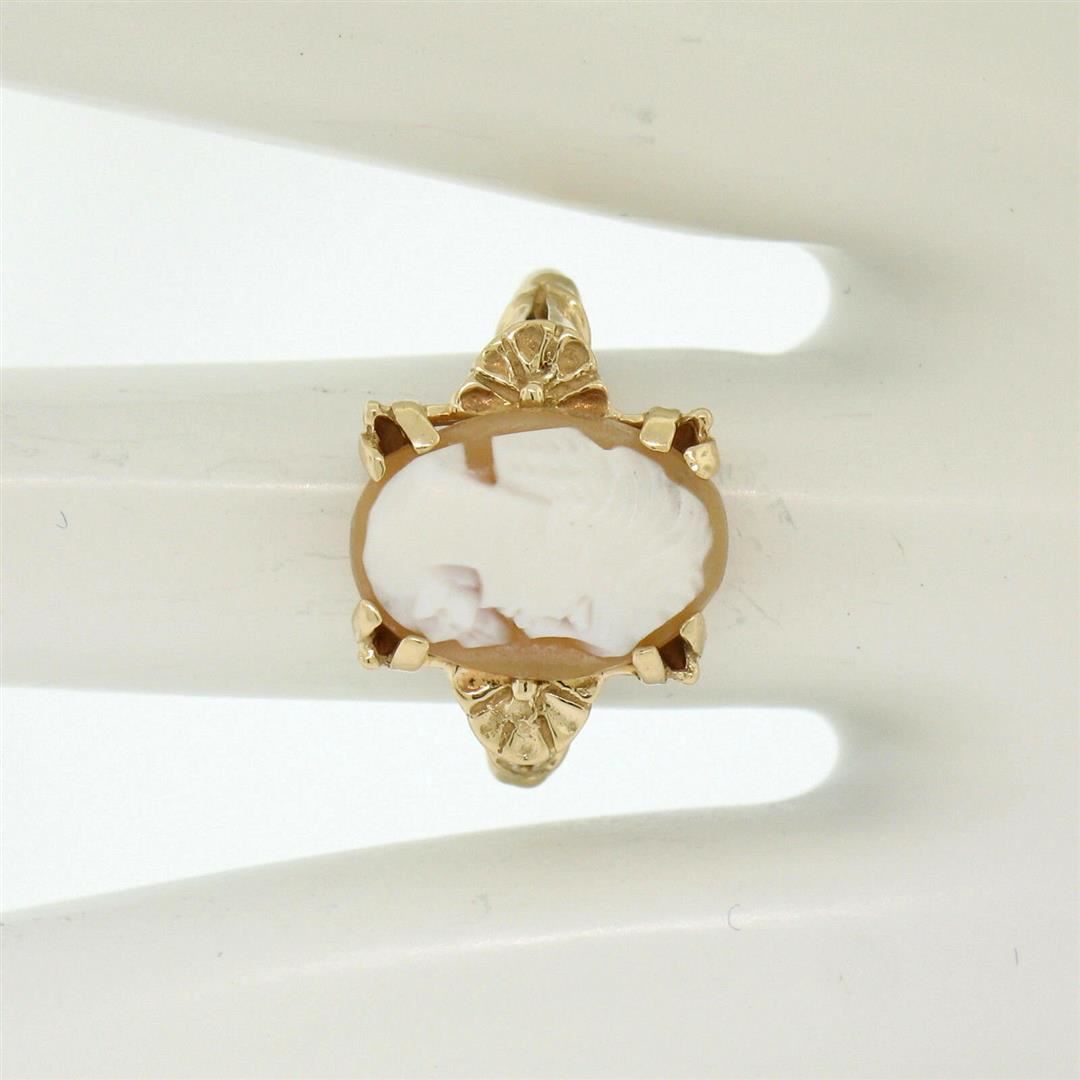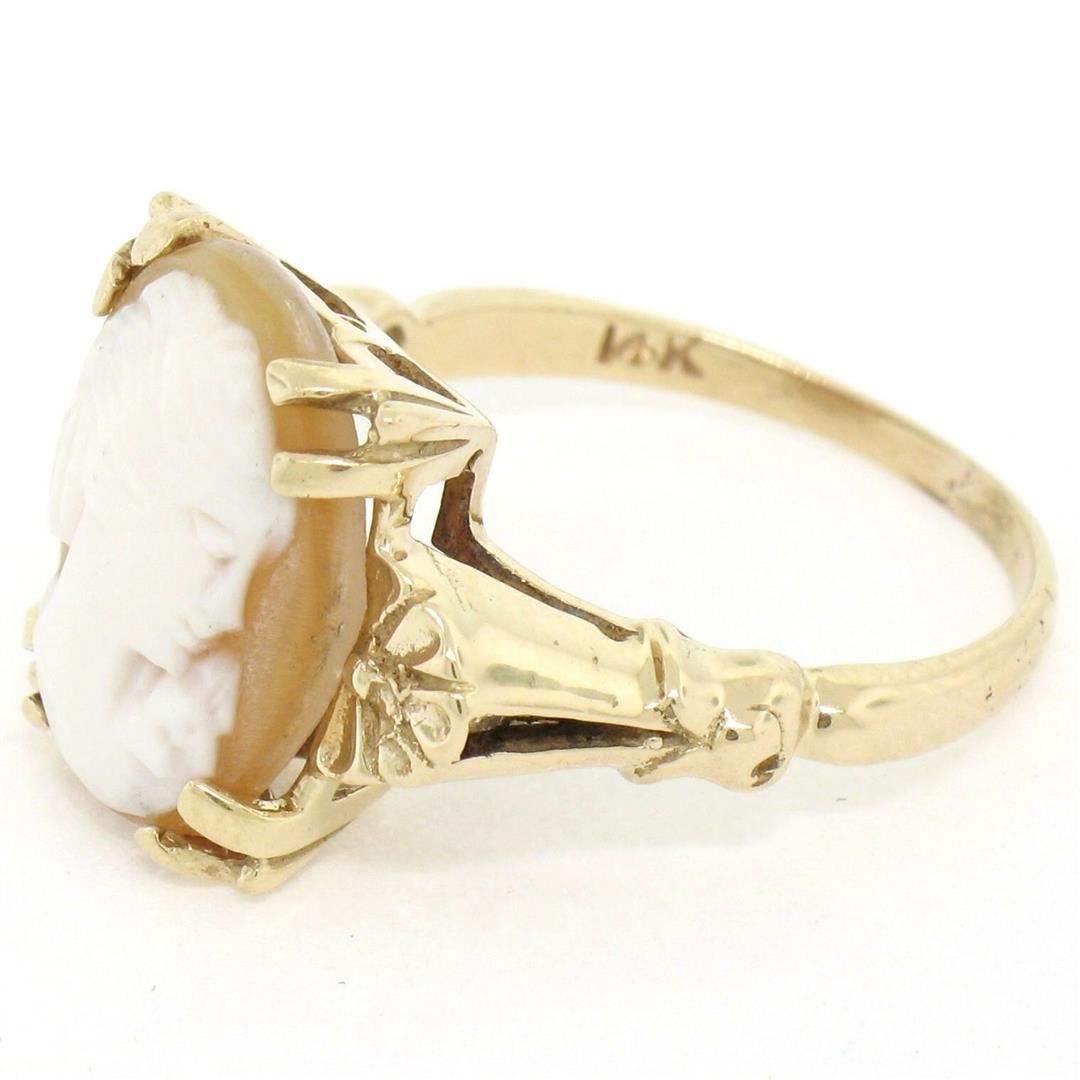 A vintage 14kt yellow gold solitaire ring featuring a carved shell cameo measuring approximately 14x10mm. The ring is size 6.0, weighs a total of 3.76 grams, and measures 14.0mm wide.