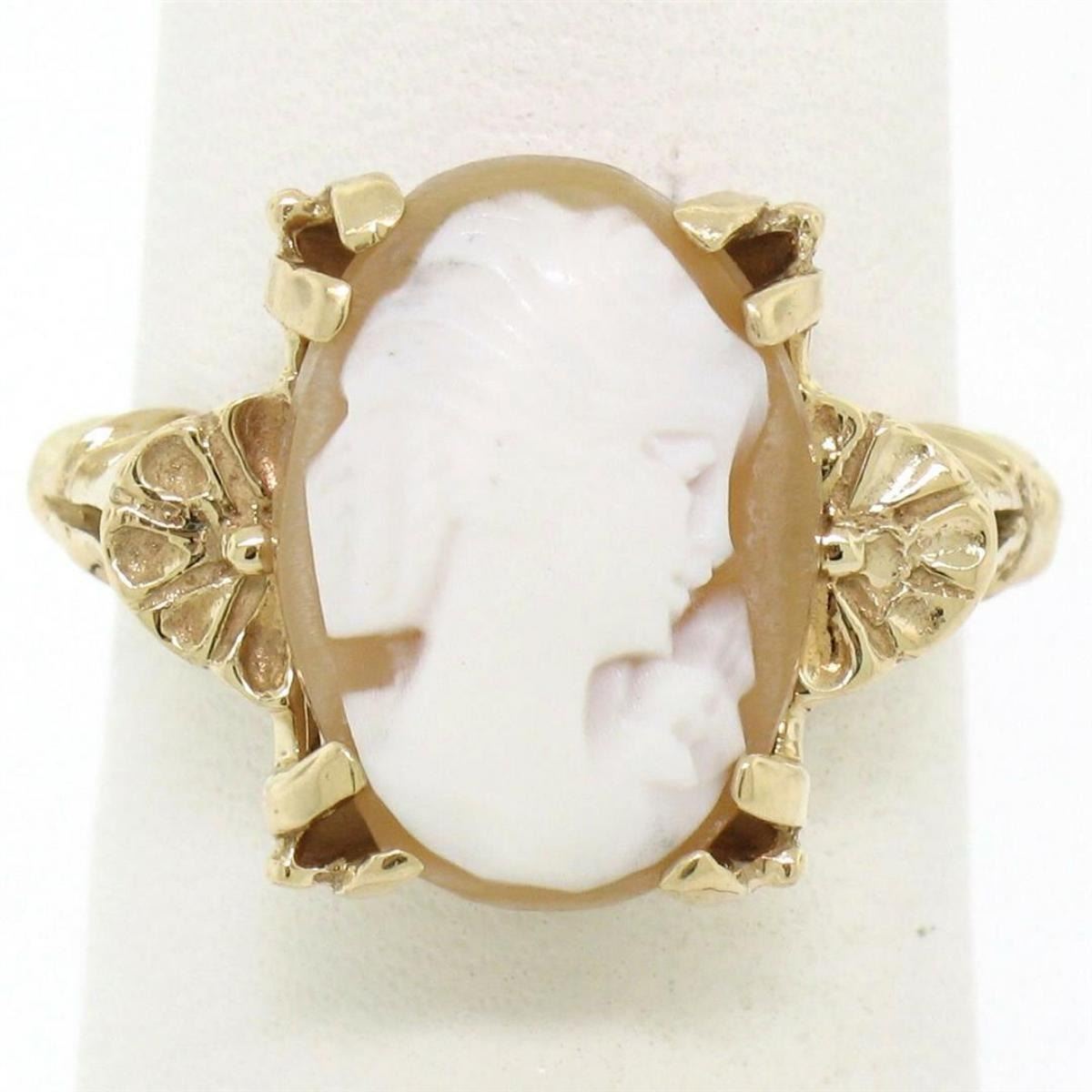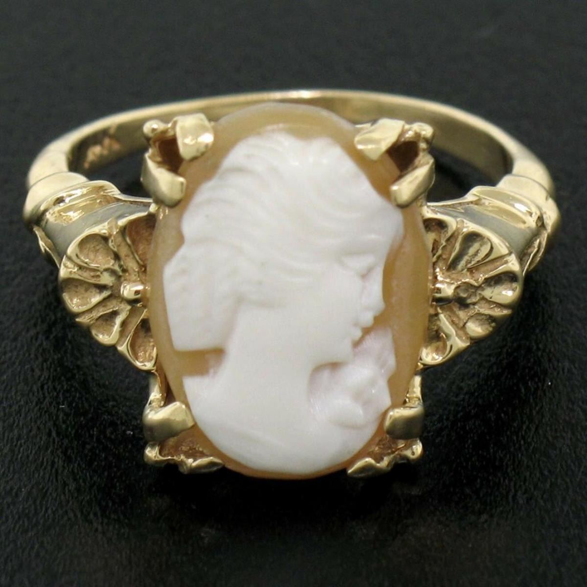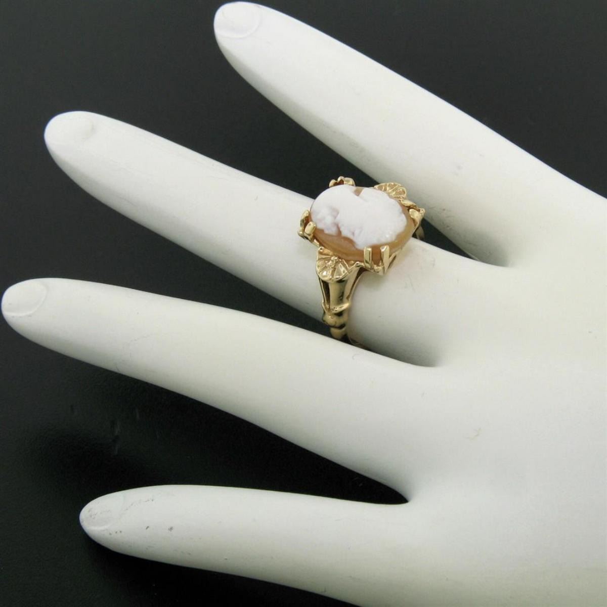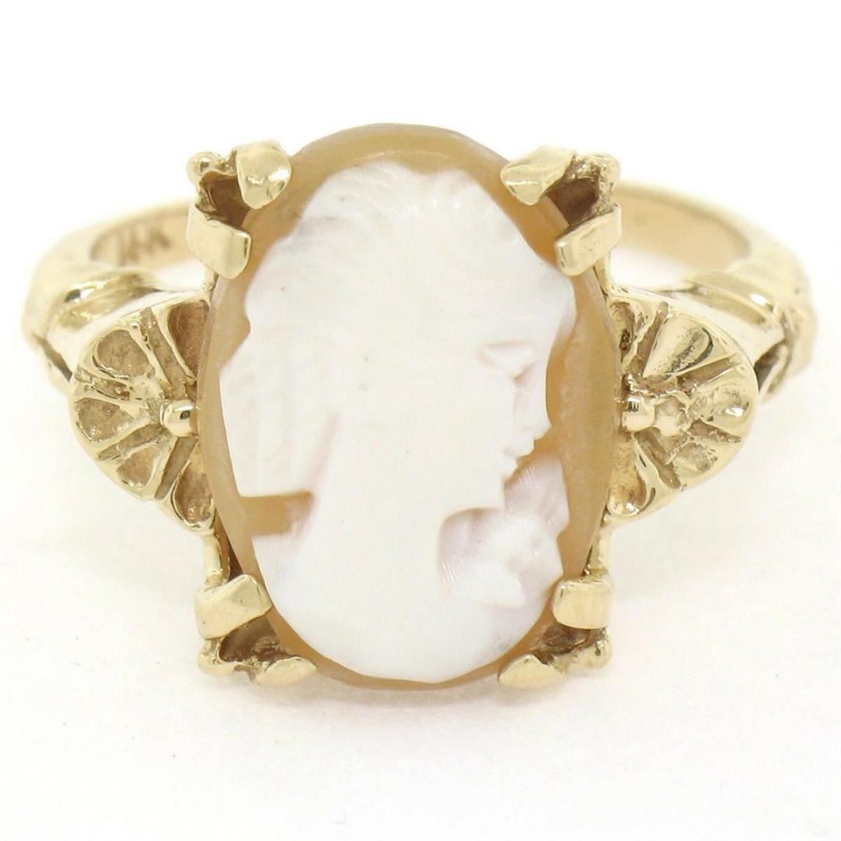 A vintage 14kt yellow gold solitaire ring featuring a carved shell cameo measuring approximately 14x10mm. The ring is size 6.0, weighs a total of 3.76 grams, and measures 14.0mm wide.