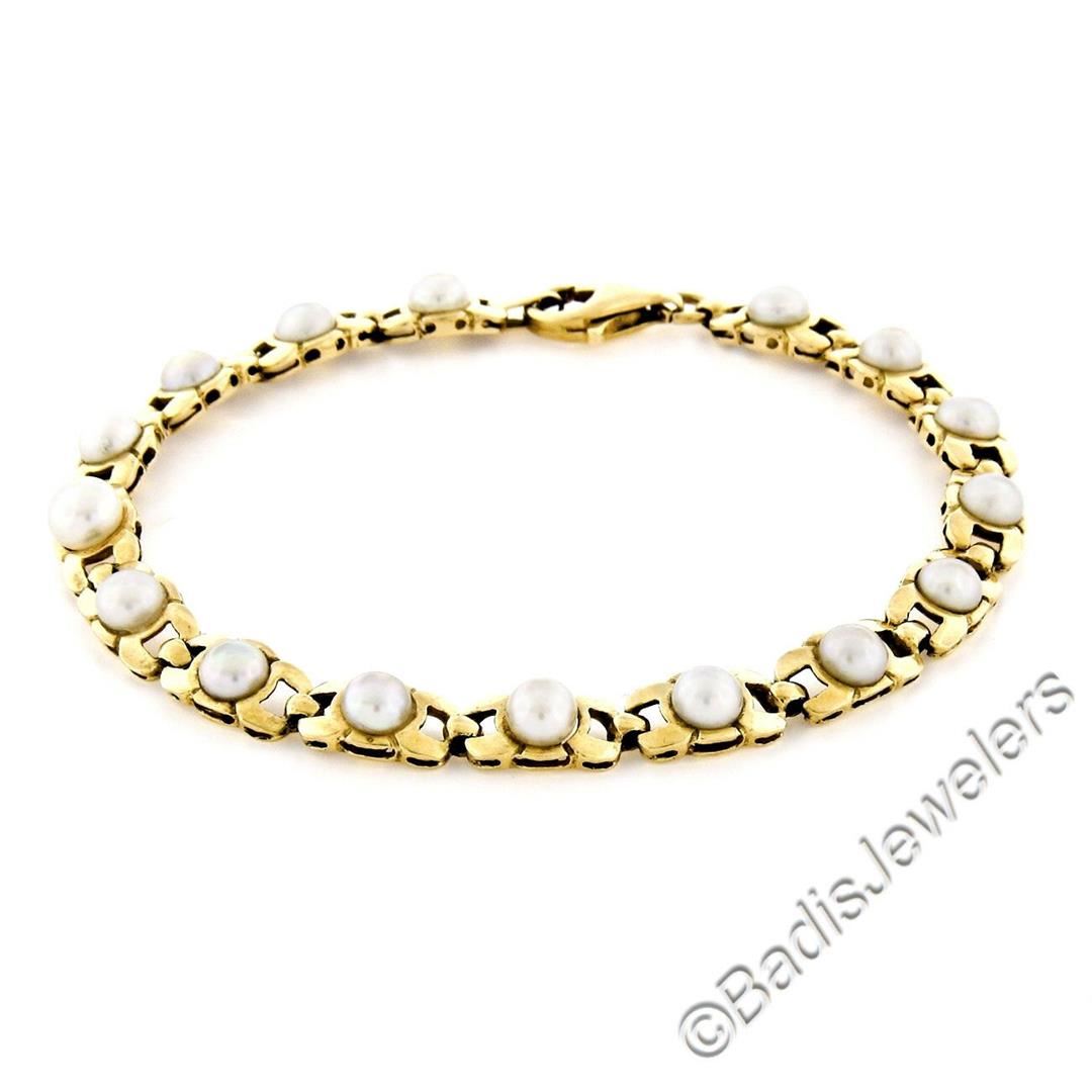 A vintage 14kt yellow gold tennis bracelet set with 16 round 4.5mm natural freshwater pearls. It weighs a total of 8.62 grams, measures 5.7mm wide, and measures 7 inches in length.