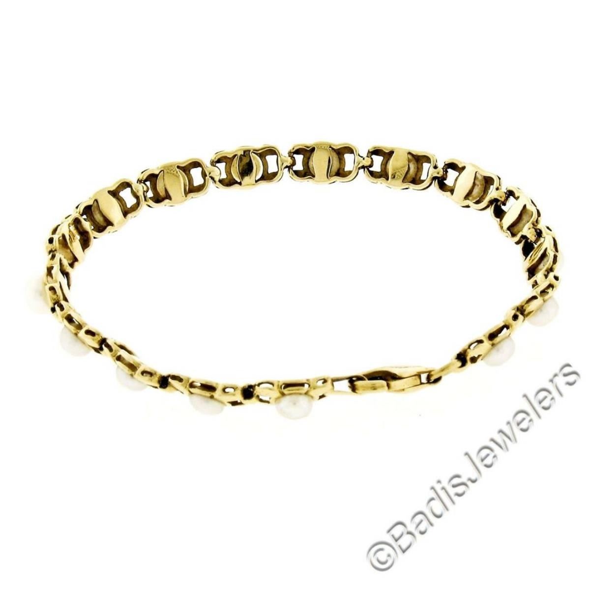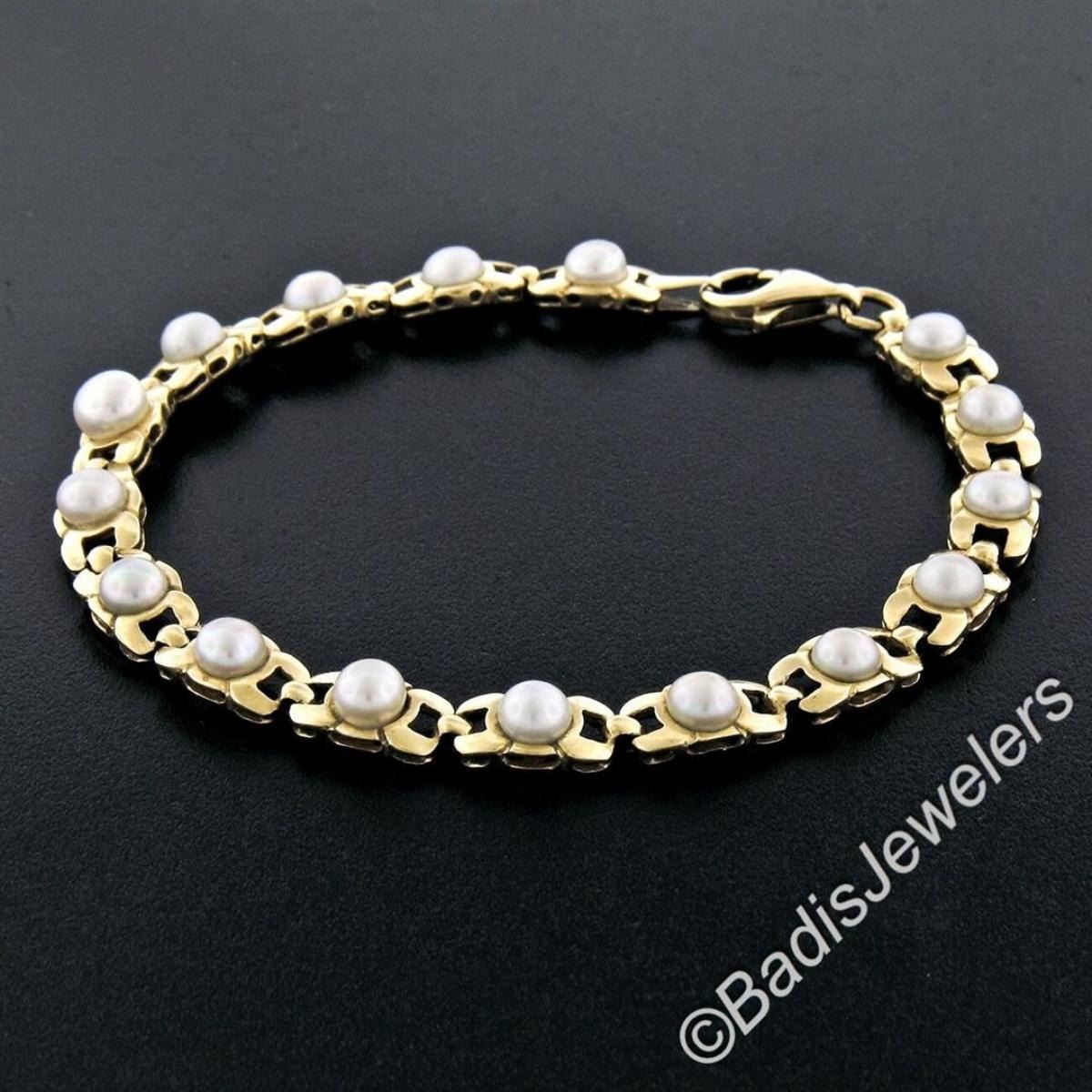 A vintage 14kt yellow gold tennis bracelet set with 16 round 4.5mm natural freshwater pearls. It weighs a total of 8.62 grams, measures 5.7mm wide, and measures 7 inches in length.