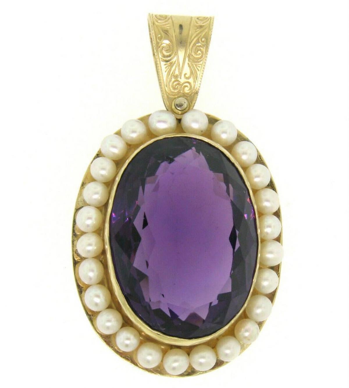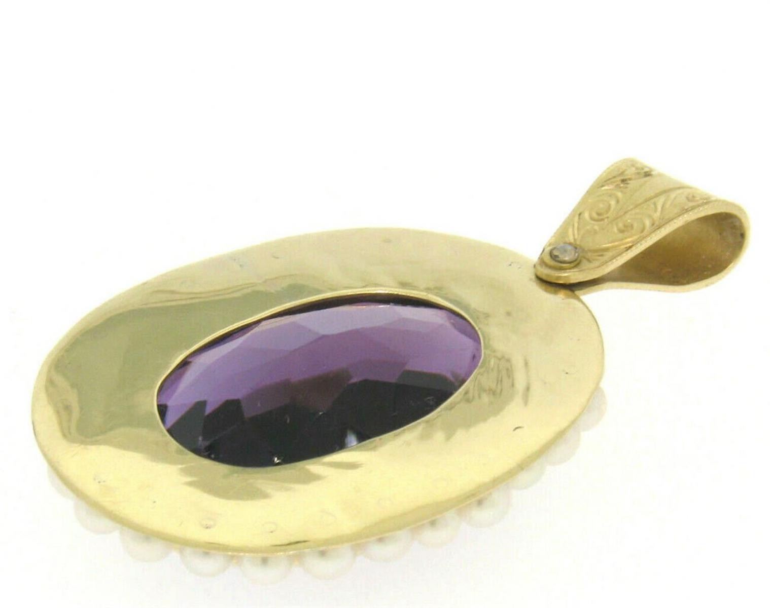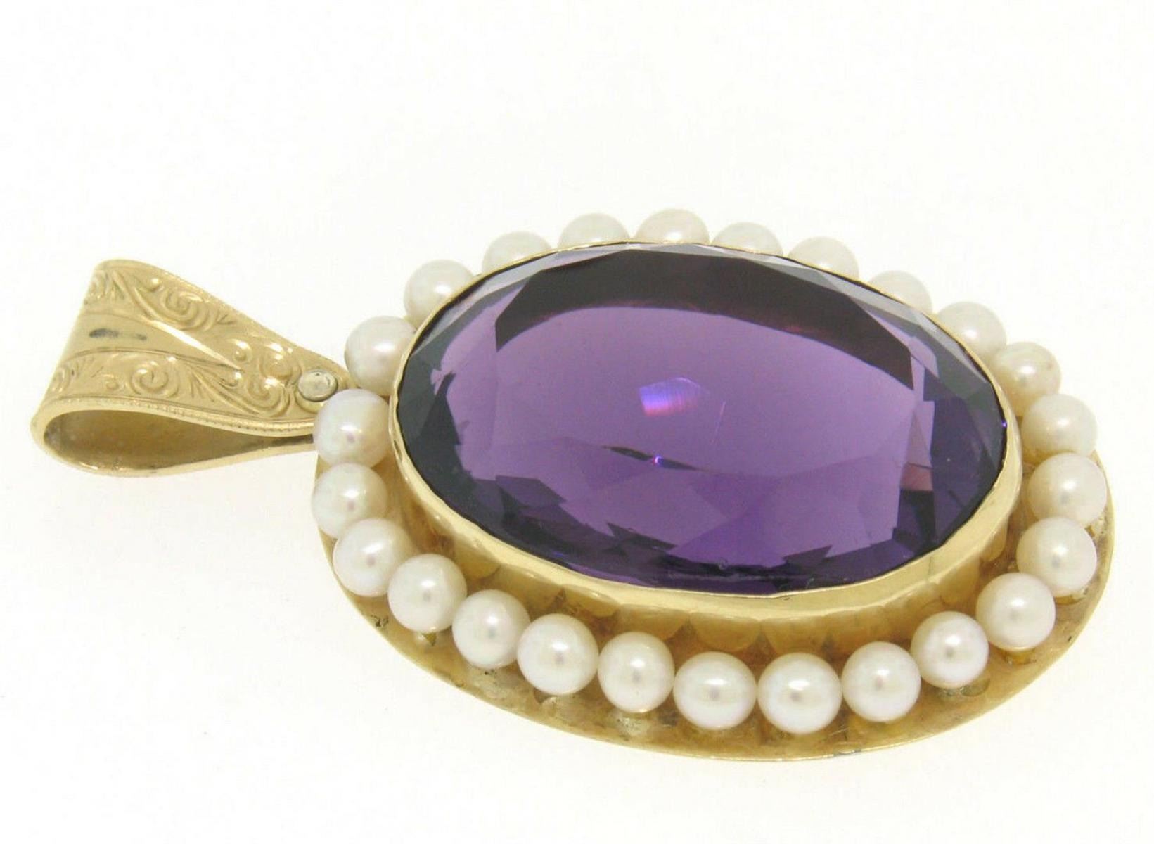 A vintage 14kt yellow gold pendant featuring a large 28.0ct oval amethyst surrounded by a halo of 3.8mm cultured pearls. The pendant weighs a total of 22.0 grams, measures 53.34x31.75mm including the bail, and the inside of the bail measures 5.0mm in diam