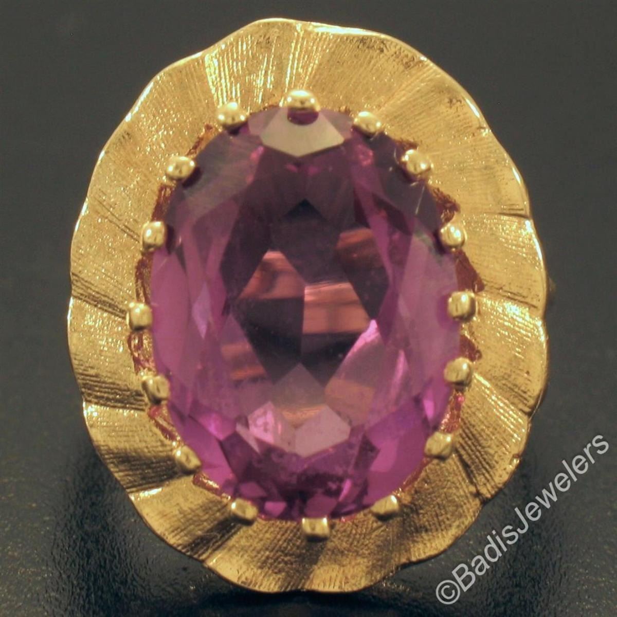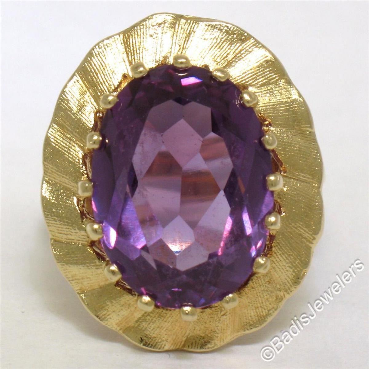 An excellent condition 14kt yellow gold ring set with an oval cut 9.27ct synthetic alexandrite surrounded by a scalloped and textured frame. The ring is size 6.5, weighs a total of 8.84 grams, and measures 22.3mm wide.