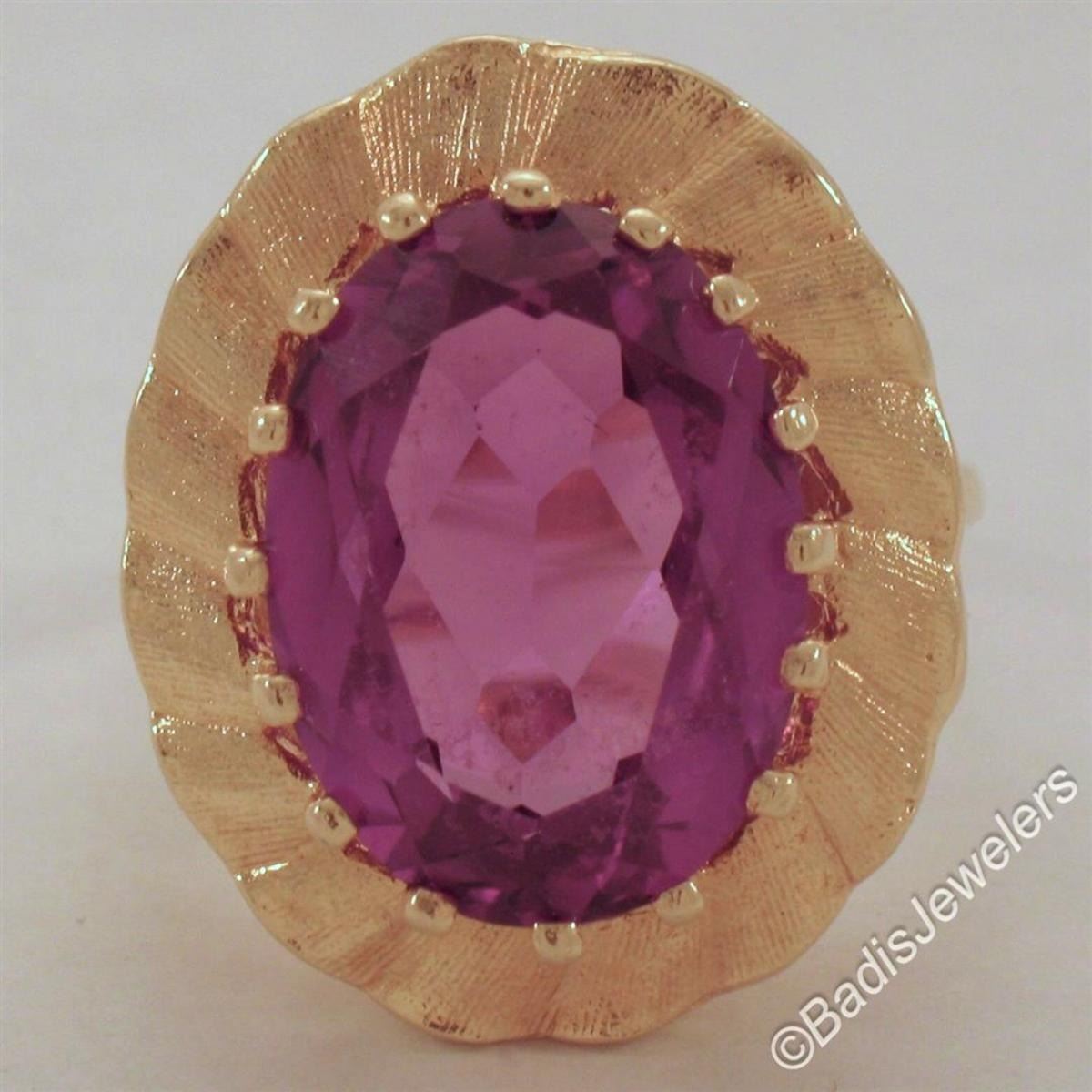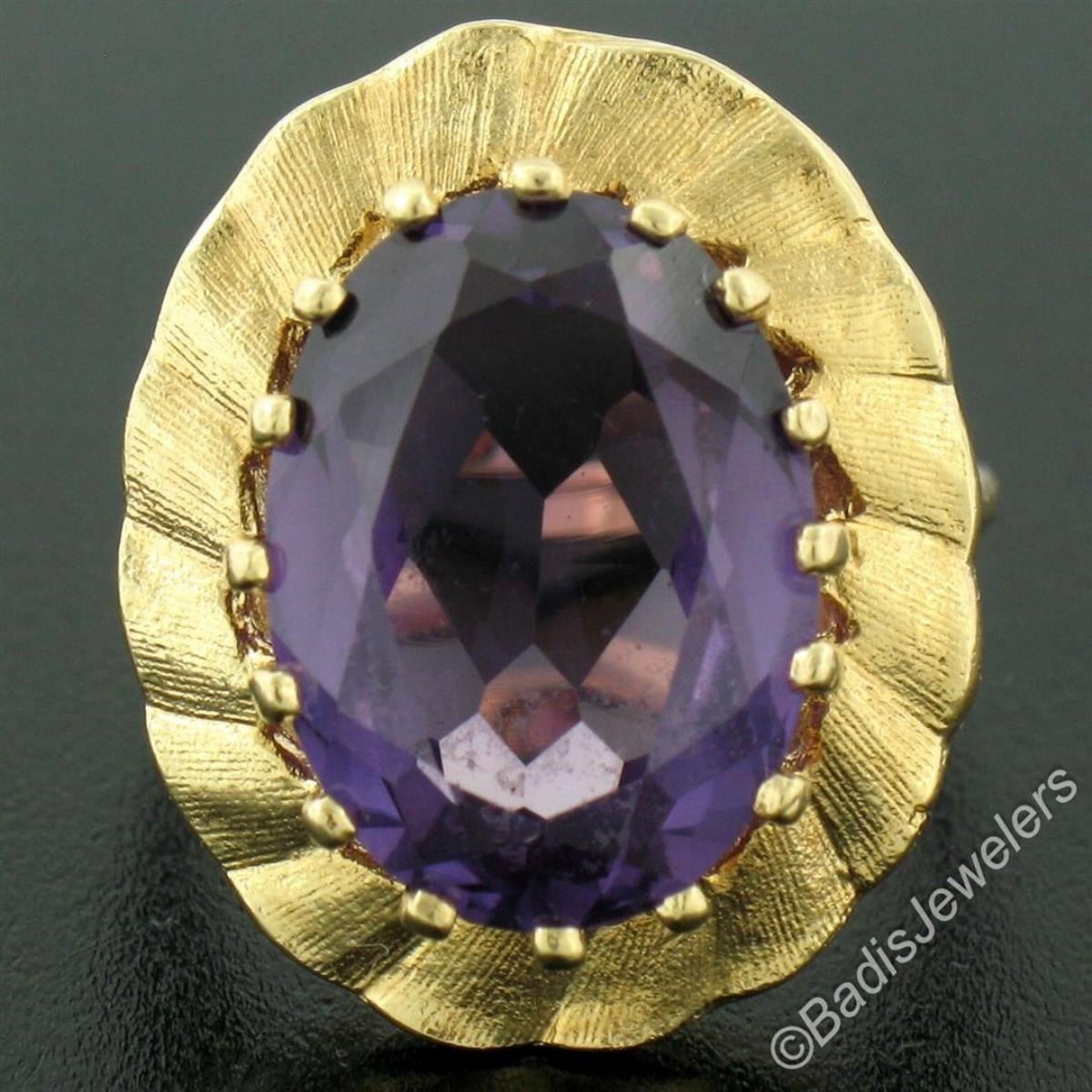 An excellent condition 14kt yellow gold ring set with an oval cut 9.27ct synthetic alexandrite surrounded by a scalloped and textured frame. The ring is size 6.5, weighs a total of 8.84 grams, and measures 22.3mm wide.
