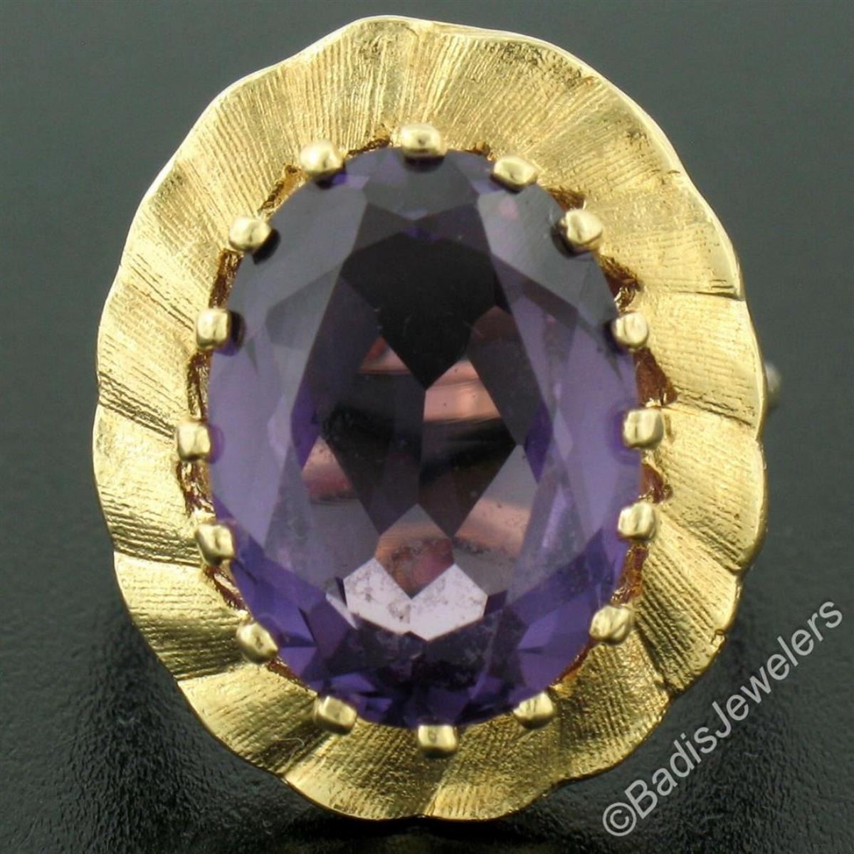 Vintage 14kt Yellow Gold Oval Synthetic Alexandrite Ring w/ Textured Halo
