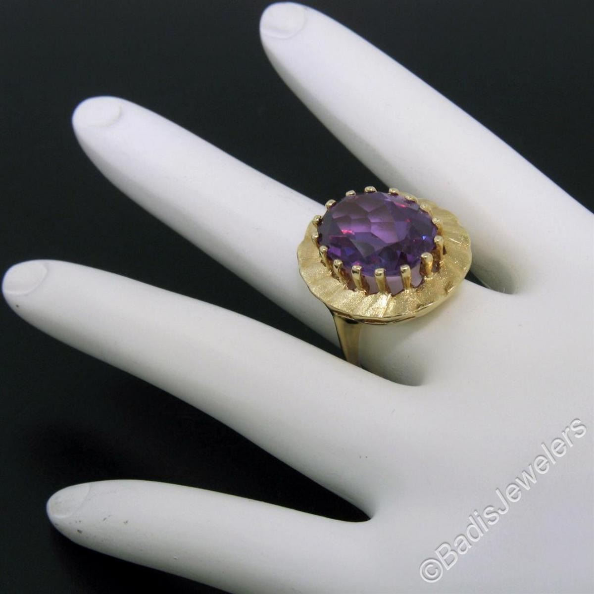 An excellent condition 14kt yellow gold ring set with an oval cut 9.27ct synthetic alexandrite surrounded by a scalloped and textured frame. The ring is size 6.5, weighs a total of 8.84 grams, and measures 22.3mm wide.