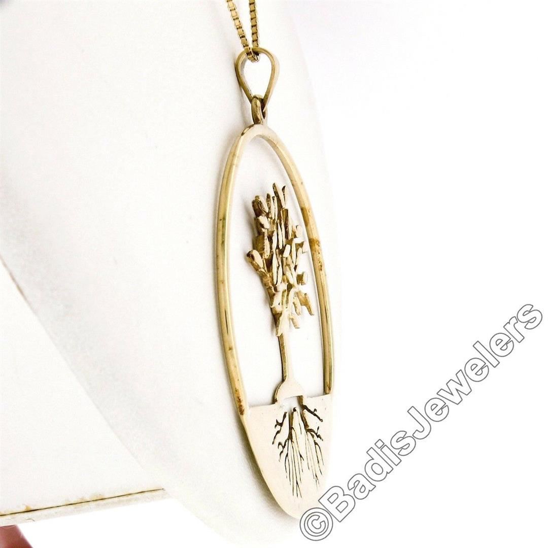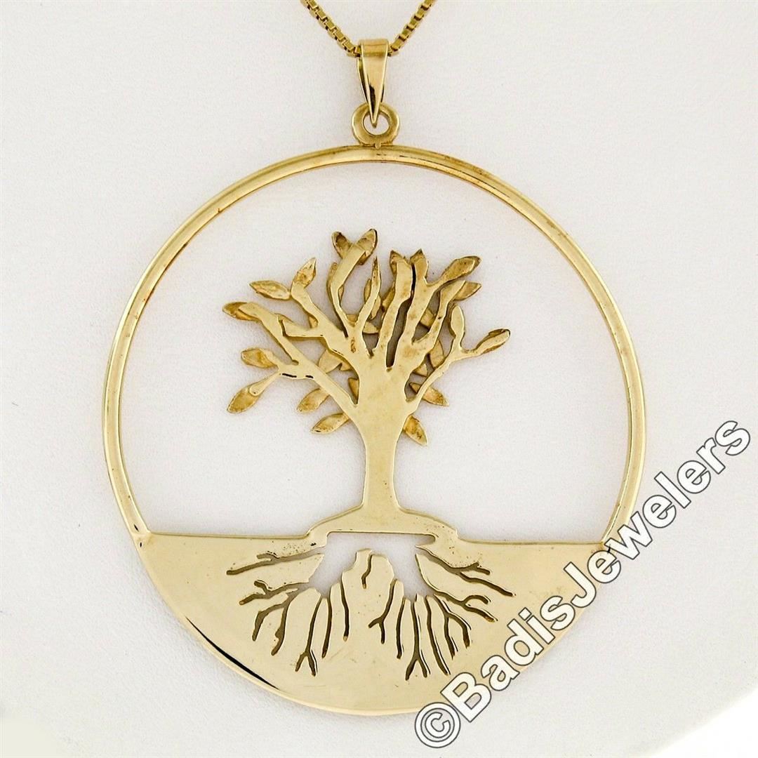 A large vintage 14kt yellow gold pendant necklace with a textured "Tree of Life" motif. Comes with a 24 inch box link chain, 12.2 grams total weight, pendant measures 59.00x46.45mm with the bail.