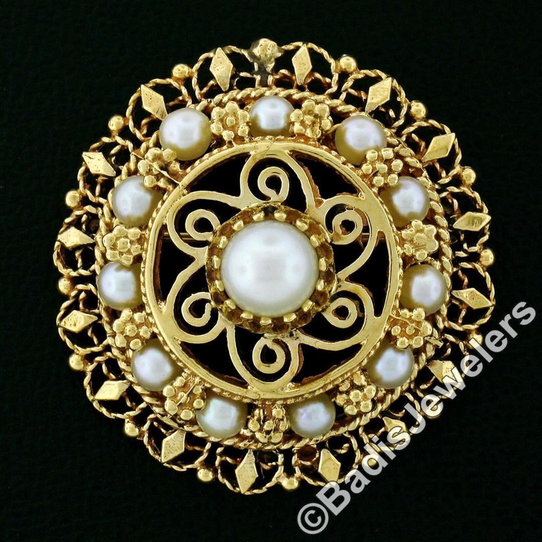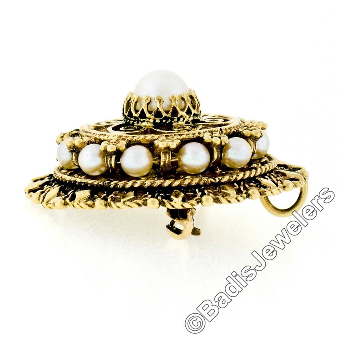 Vintage 14kt Yellow Gold Tiered Pearl, Open Work, & Twisted Wire Brooch or Penda