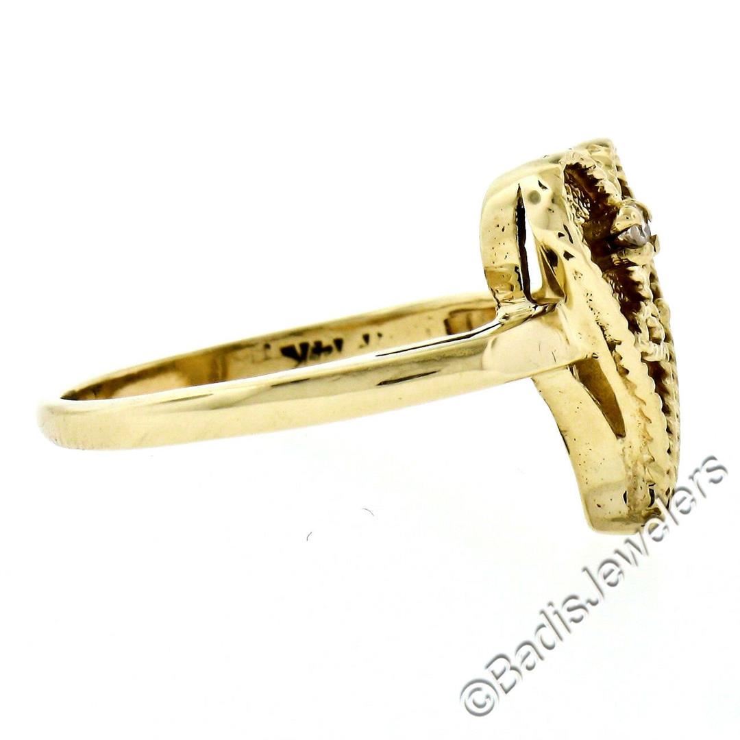 An excellent condition 14kt yellow gold heart and flower ring prong set with a 0.03ct round single cut diamond (G - VS2). The ring is size 7, weighs a total of 2.80 grams, and measures approximately 13.25mm wide.