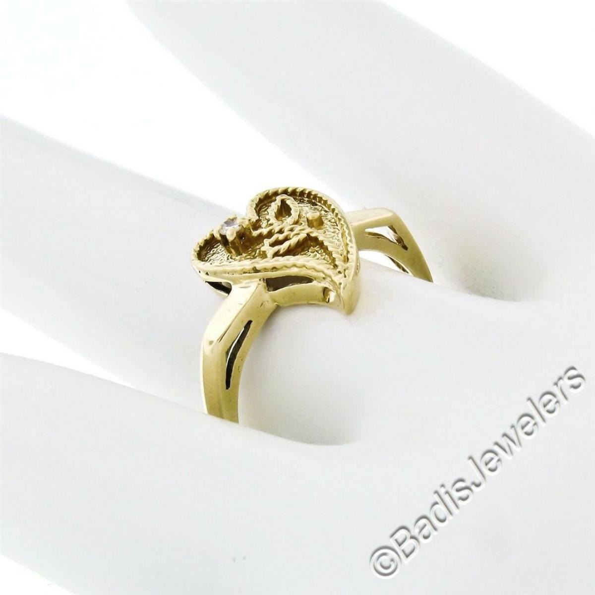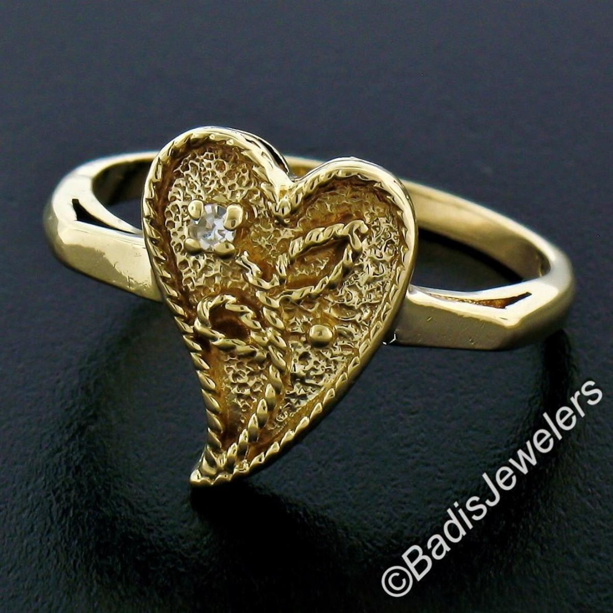An excellent condition 14kt yellow gold heart and flower ring prong set with a 0.03ct round single cut diamond (G - VS2). The ring is size 7, weighs a total of 2.80 grams, and measures approximately 13.25mm wide.