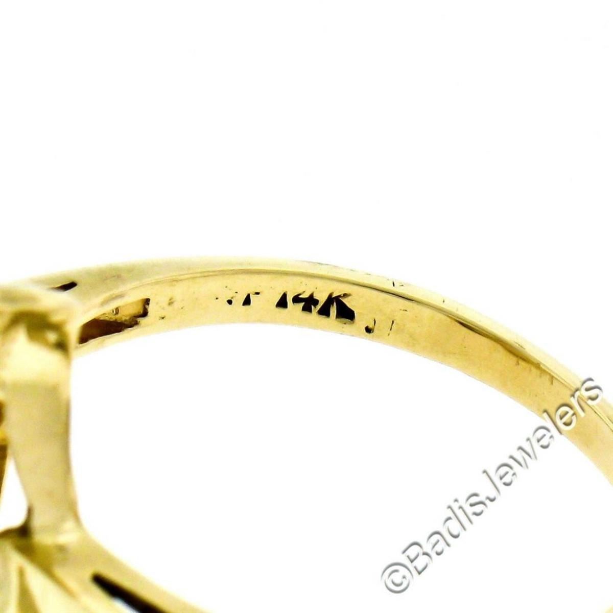 An excellent condition 14kt yellow gold heart and flower ring prong set with a 0.03ct round single cut diamond (G - VS2). The ring is size 7, weighs a total of 2.80 grams, and measures approximately 13.25mm wide.