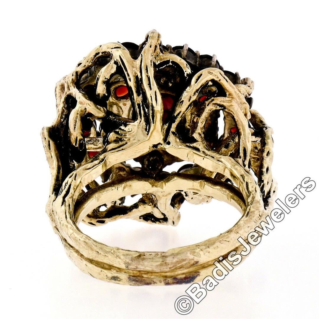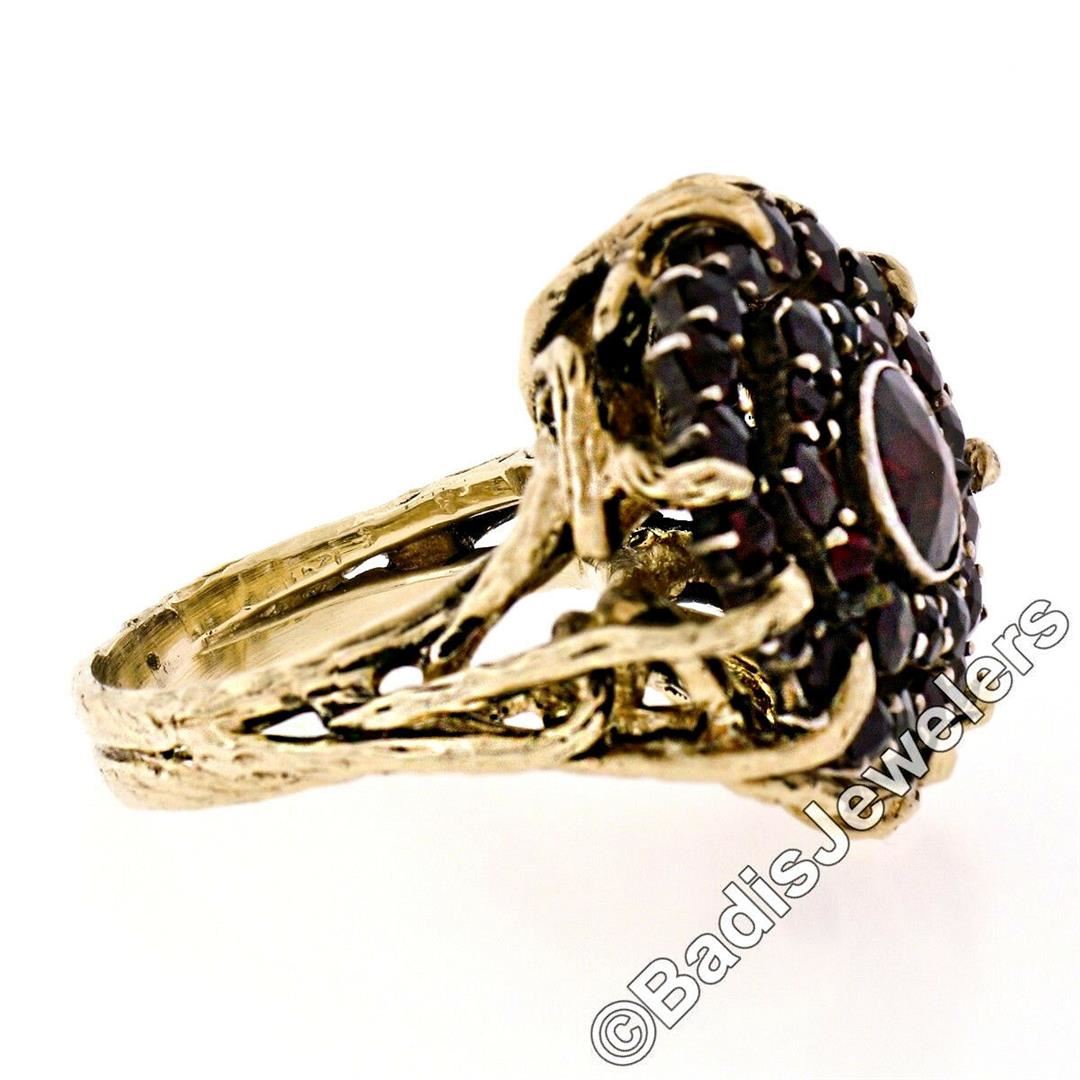 A vintage 14kt yellow gold cluster ring featuring a 7.4mm round garnet set at its center in a sterling silver-topped bezel among 30 additional round cut garnets. The ring is size 7.5, weighs a total of 16.18 grams, and measures 23.85mm wide.