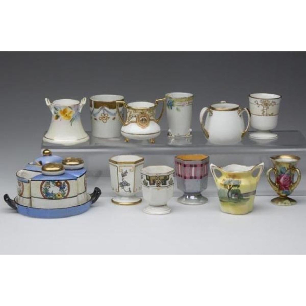 Group of 11 hand-painted Japanese china toothpick holders, together with a 5 piece circa 1908 Noritake Chikaramachi Japanese lusterware condiment set ( includes salt, pepper, toothpick holder & sugar with small