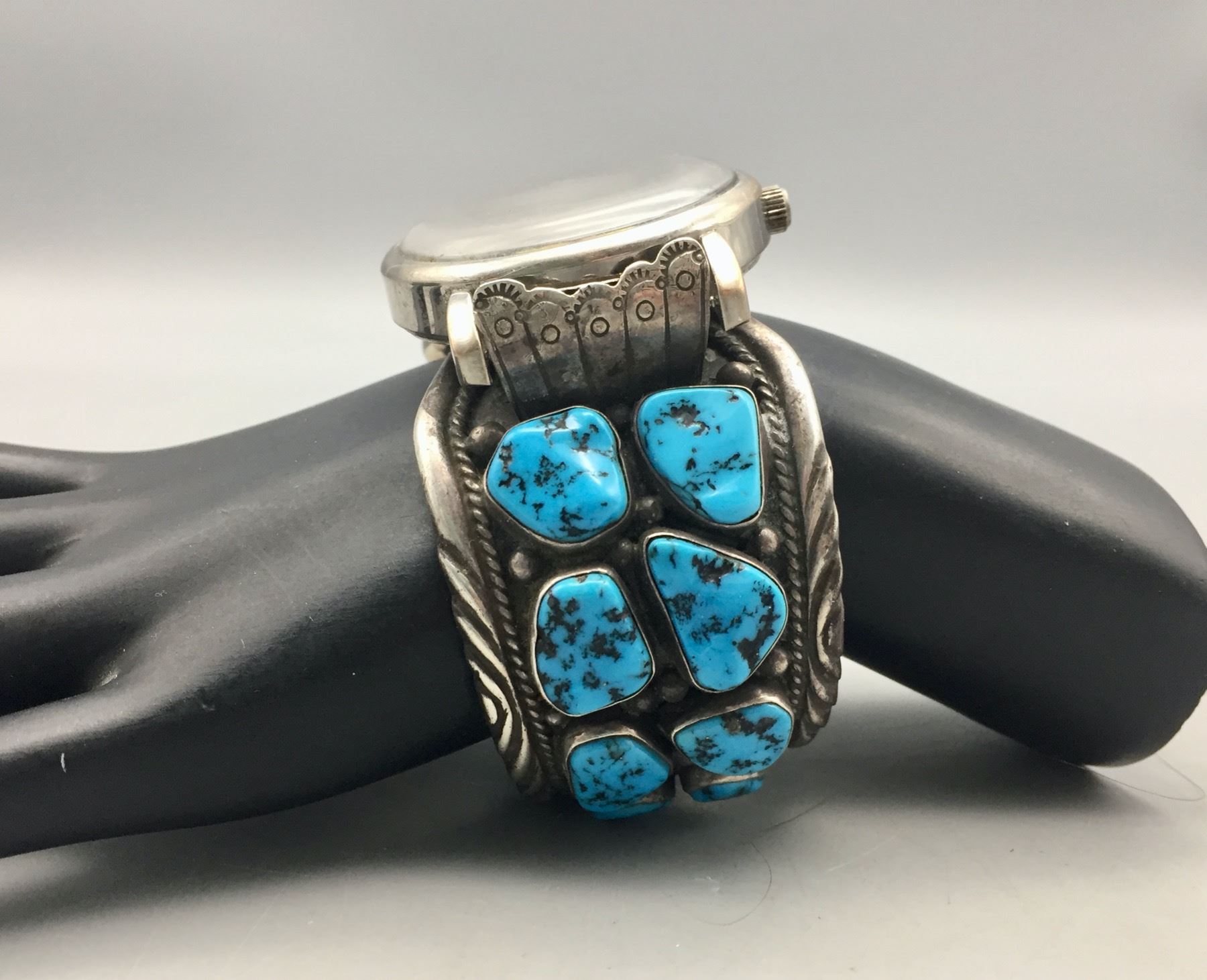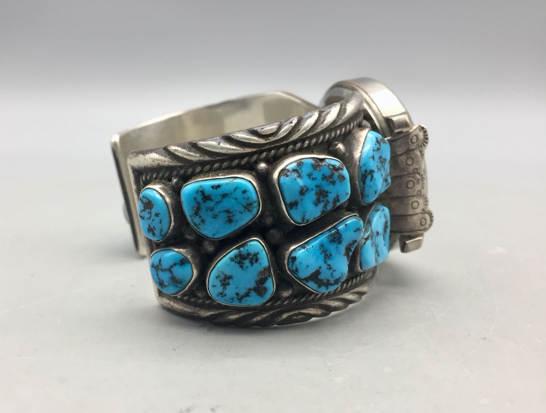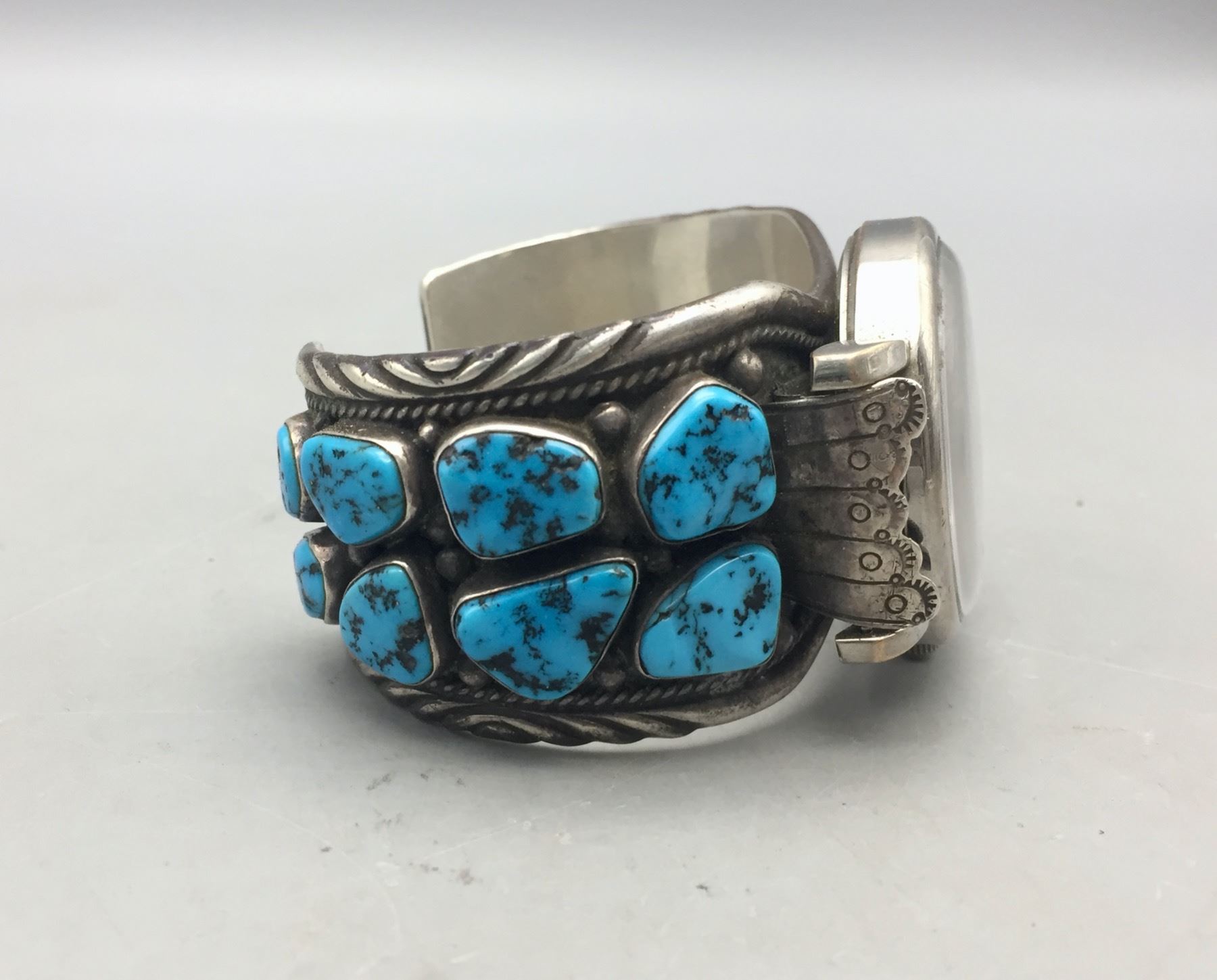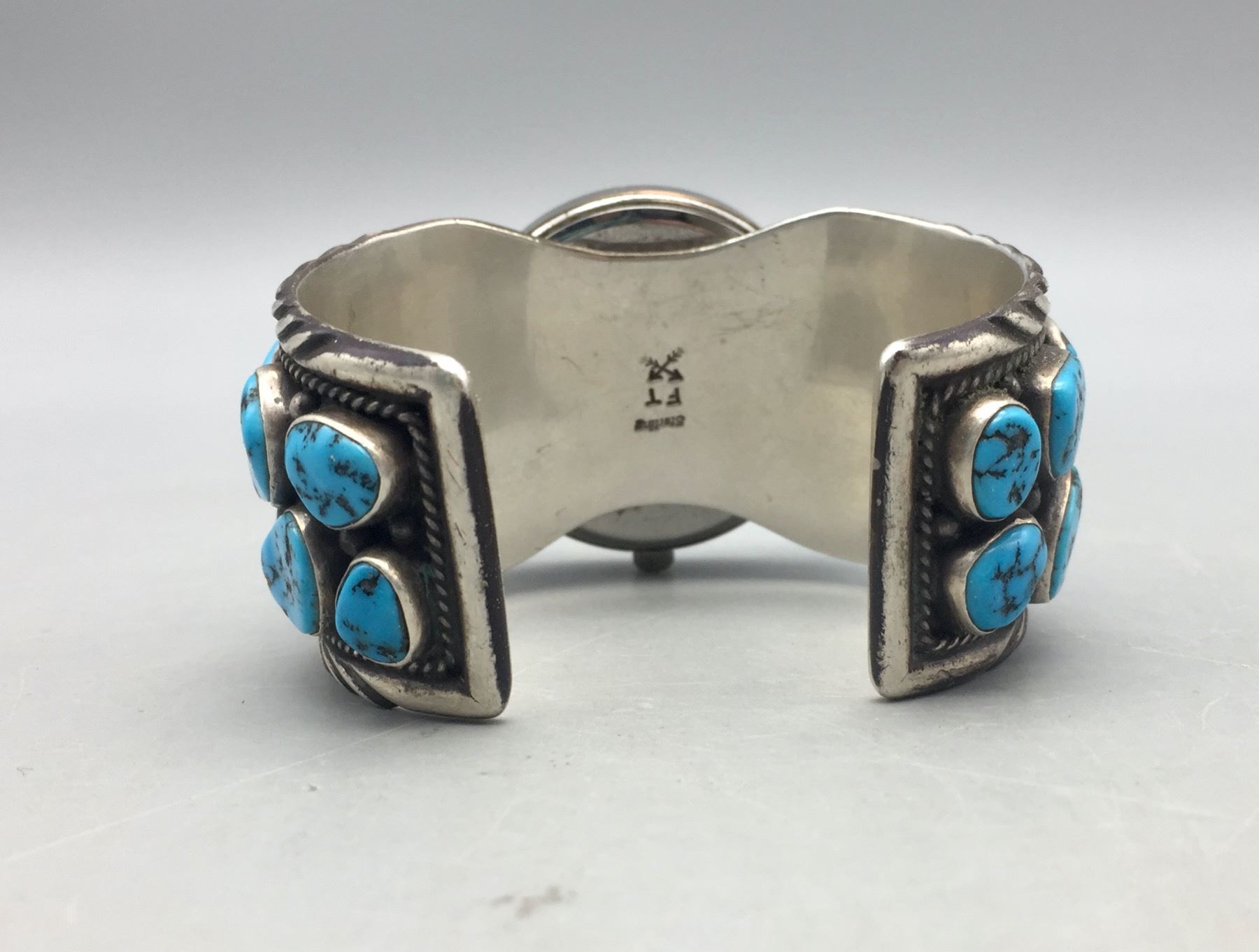 Description: For sale in this lot we have a vintage turquoise watch cuff bracelet set with 16 turquoise stones! Marked as sterling silver. Maker: Hallmarked with crossed arrows and FT.. Approx. Age: Vintage. Size: Inside circumference 5-7/8 inches long. Opening is additional 1-1/8 inches, fitting a 7 inch wrist. Width is 1-1/2 inches. Weighs 128.8 grams. Condition: Good for its age, normal wear expected. Please look closely at the pictures - they are an important part of our description. Shipping: There will be a $5 handling, packaging fee for shipping this lot. The actual cost of postage will be added on top of that.