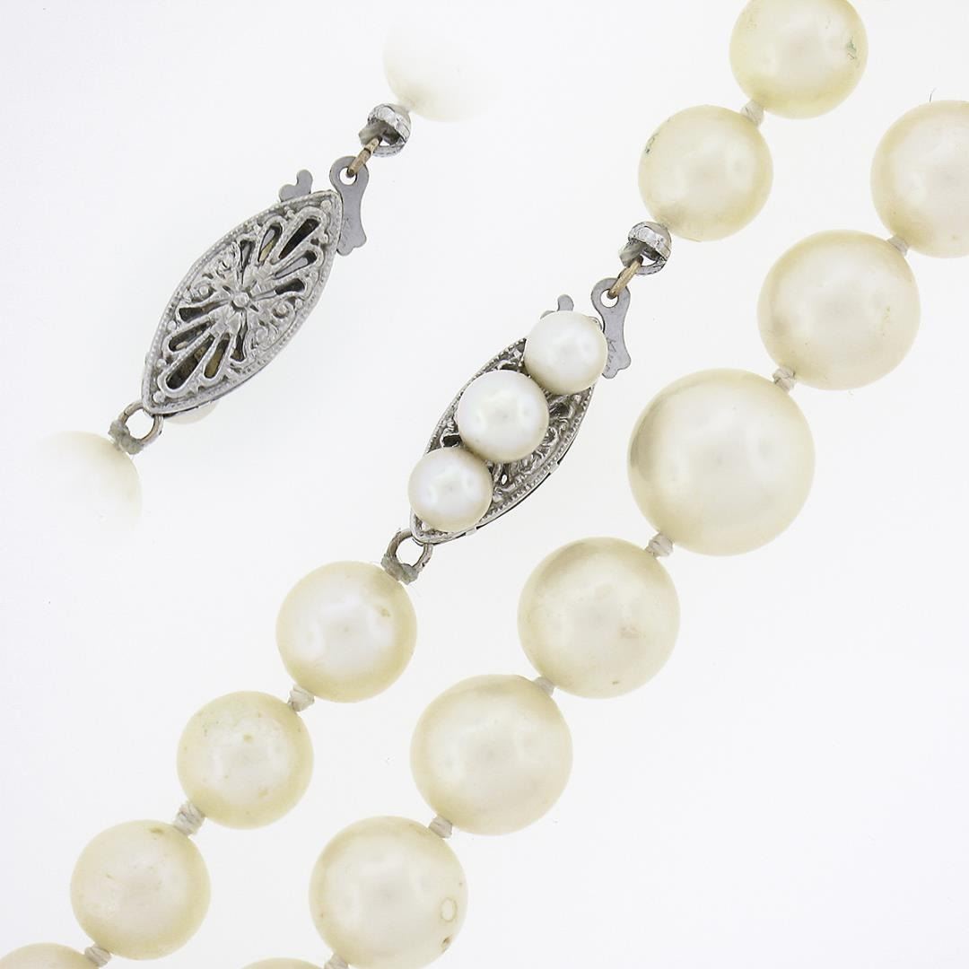A vintage strand necklace with 14k white gold clasp, featuring 53 round shape cultured pearls (9.5mm to 7mm each), and 3 round shape cultured pearls on clasp (4.25mm to 4.7mm each). It weighs a total of 33.27 grams, measures 9.5mm wide, and measures 18 inches in length.