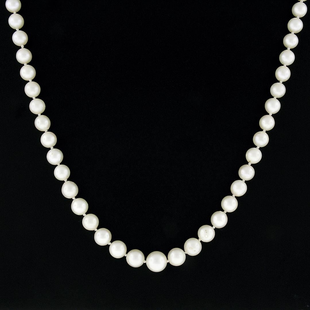 A vintage strand necklace with 14k white gold clasp, featuring 53 round shape cultured pearls (9.5mm to 7mm each), and 3 round shape cultured pearls on clasp (4.25mm to 4.7mm each). It weighs a total of 33.27 grams, measures 9.5mm wide, and measures 18 inches in length.
