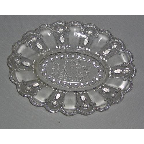 Of EAPG from the 1890s, this plate measures 10 x 8 inches. It is decorated in an intricate design of scallops and beads within oval panes. Around the edge of the plate, the decor of the panes alternates, with one clear and the next with circles and ovals. The center of the plate is a large oval surrounded by beads. It includes the stylized text "Our Daily Bread."<p>