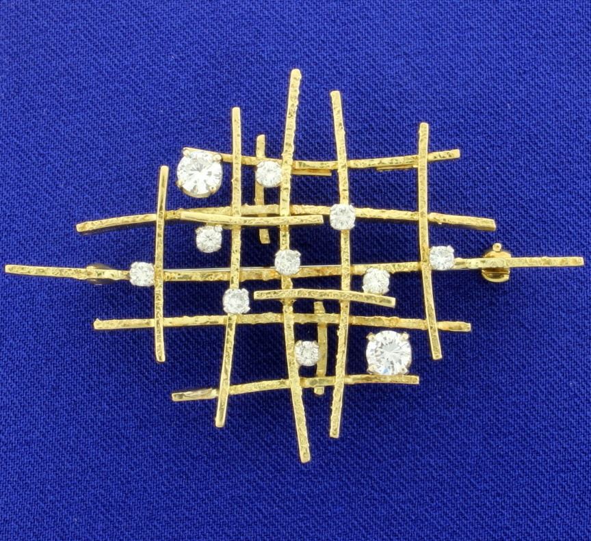 This pin is 18K yellow gold and is 2 1/2 inches long. It contains eleven high quality diamonds ranging from .37ct to .05ct, all VS clarity/F color. 21.9g