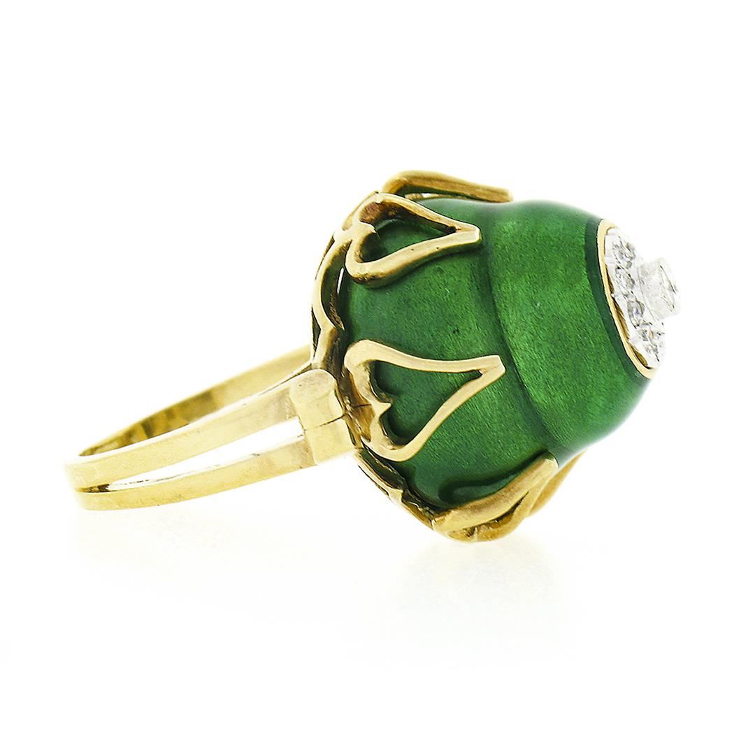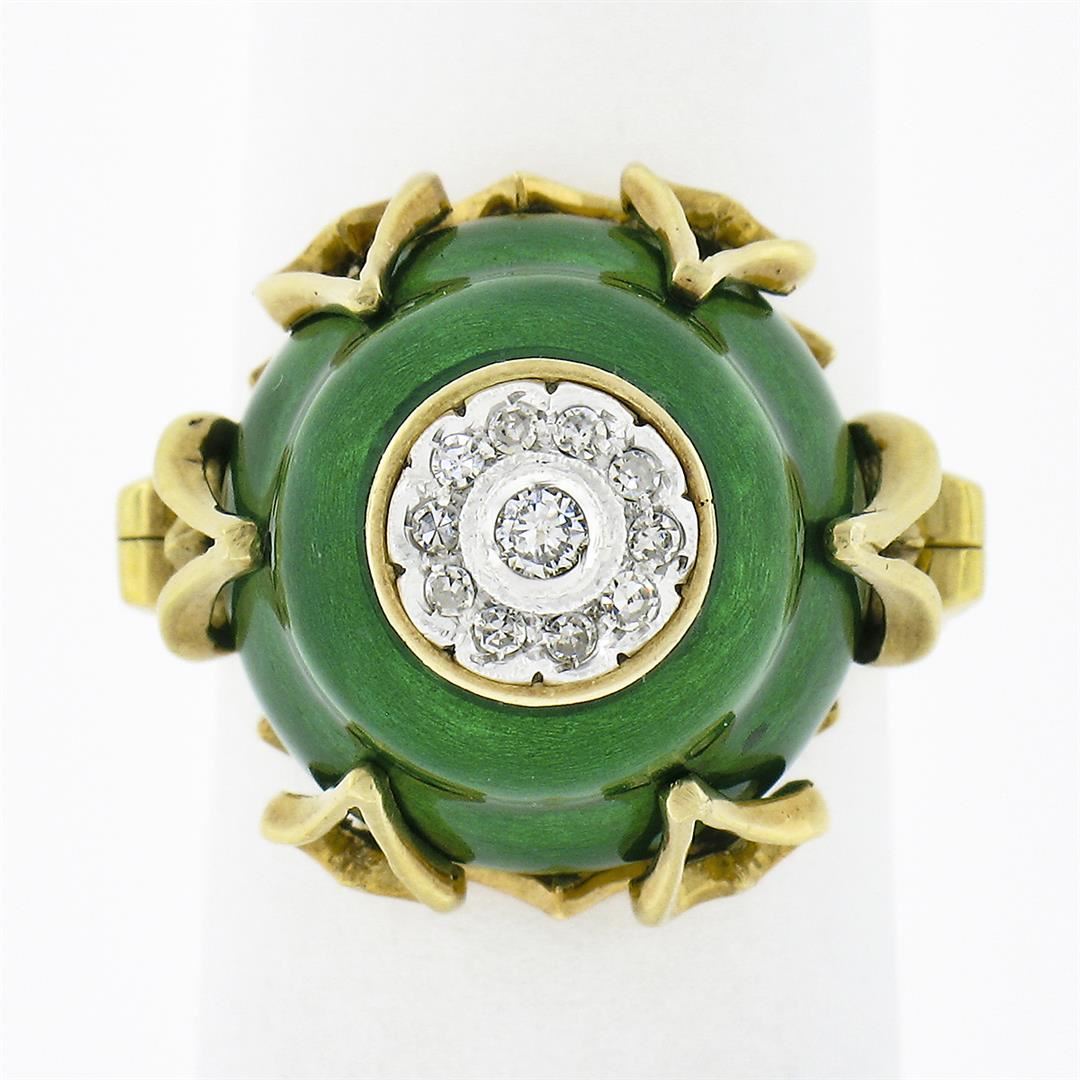 A solid 18k yellow gold statement tall ring, with 11 old single cut natural diamonds (G/H - VS1/VS2 ; 0.15ctw), and enamel work. The ring is size 5.0, weighs a total of 11.43 grams, and measures 17.60mm wide.
