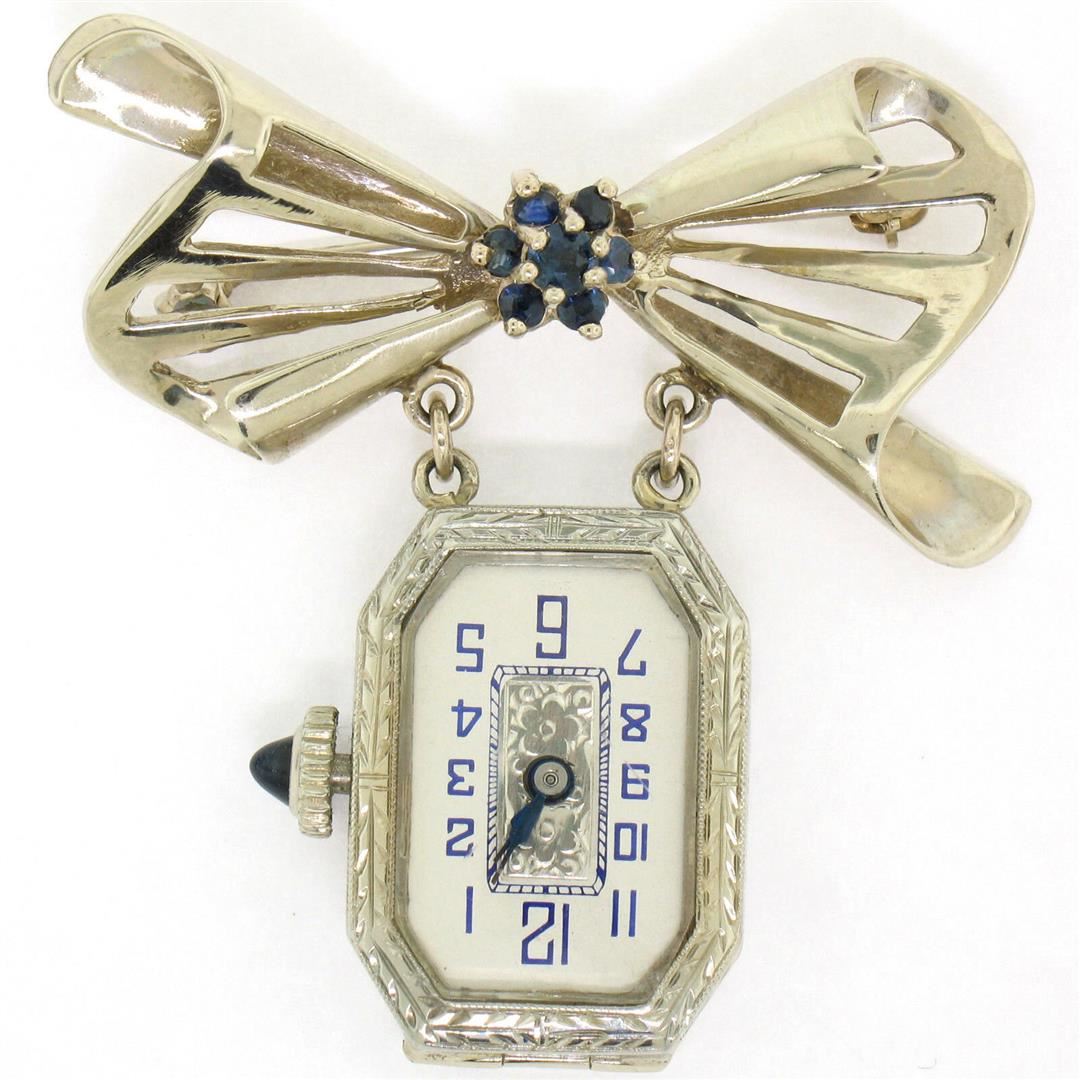 One Vintage 18K Gold 12pt Sapphire 15 Jewels Untermeyer Robbins Watch Bow Pin Brooch. Item Details: Material (Watch Case): Solid 18K White Gold, Material (Pin): Solid 14K White Gold, Total Weight: 15.6 Grams, Stones: (7) Natural Genuine Sapphires - Round Cut - Prong Set - Royal Blue Color - 0.12ctw (approx.), Movement: Swiss Made - Mechanical - Hand Winding - 15 Jewels - Adjusted for 2 Positions, Overall Height: 40.60mm, Overall Width: 39.40mm (pin), 19.73mm (watch), Overall Thickness: 6.78mm Clasp: Pin Back w/ Rotating Lock Condition: Vintage piece. Excellent physical and running condition!