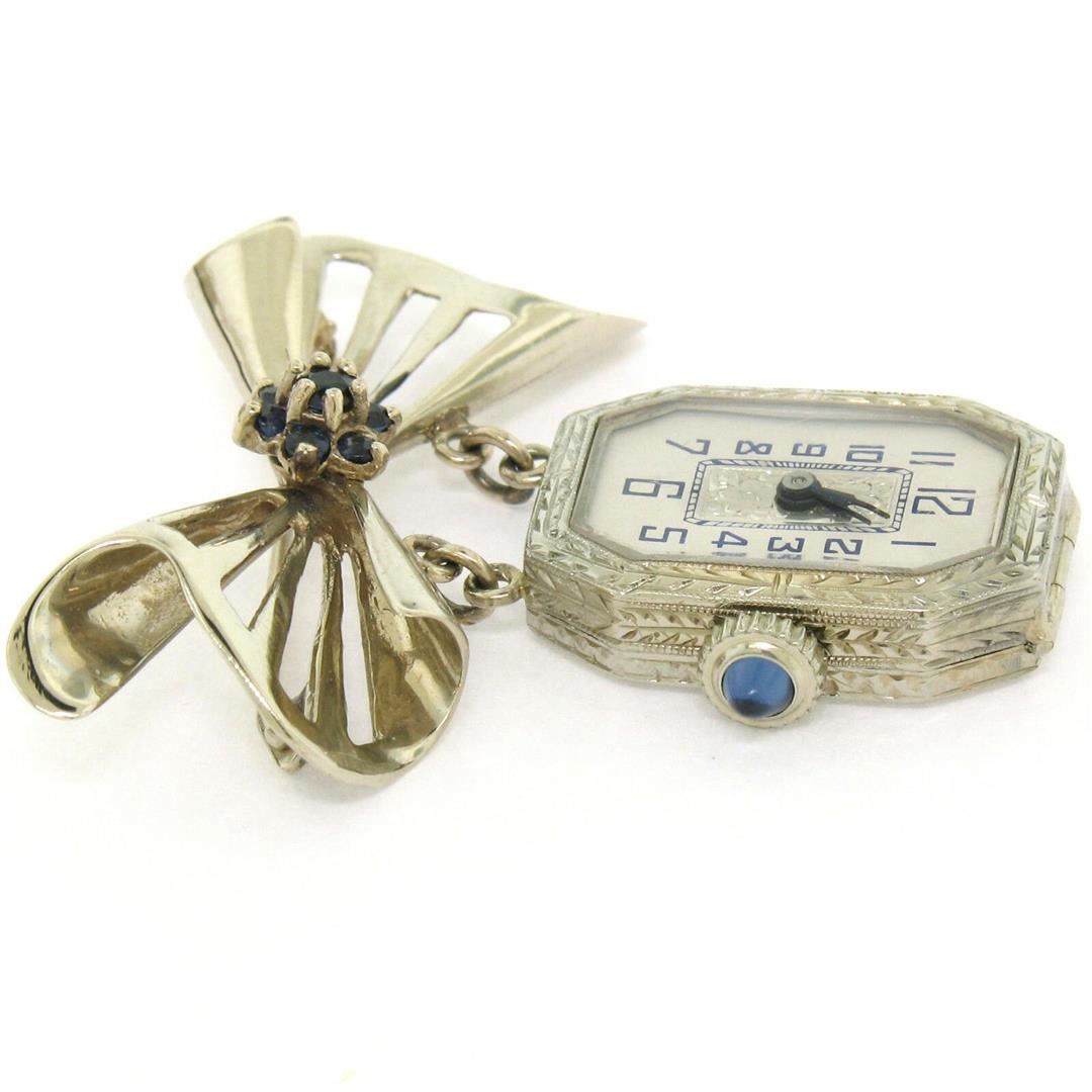 One Vintage 18K Gold 12pt Sapphire 15 Jewels Untermeyer Robbins Watch Bow Pin Brooch. Item Details: Material (Watch Case): Solid 18K White Gold, Material (Pin): Solid 14K White Gold, Total Weight: 15.6 Grams, Stones: (7) Natural Genuine Sapphires - Round Cut - Prong Set - Royal Blue Color - 0.12ctw (approx.), Movement: Swiss Made - Mechanical - Hand Winding - 15 Jewels - Adjusted for 2 Positions, Overall Height: 40.60mm, Overall Width: 39.40mm (pin), 19.73mm (watch), Overall Thickness: 6.78mm Clasp: Pin Back w/ Rotating Lock Condition: Vintage piece. Excellent physical and running condition!