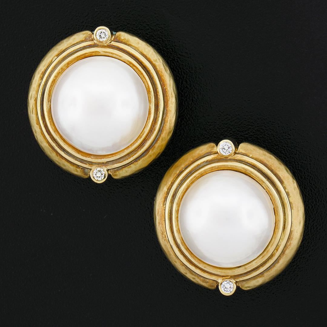 A vintage solid 18k yellow gold button earrings, with 2 round shape Mabe pearls (13.1mm each), and 4 round brilliant cut natural diamonds (G/H - VS1/VS2 ; 0.10ctw). The earrings measure approximately21.20x20.70mm and weigh a total of 15.47grams.