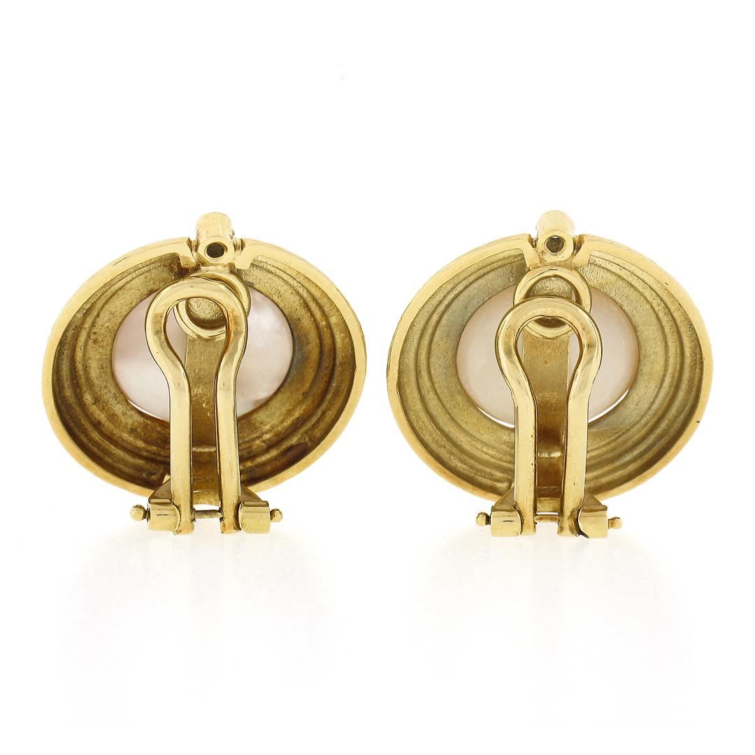 A vintage solid 18k yellow gold button earrings, with 2 round shape Mabe pearls (13.1mm each), and 4 round brilliant cut natural diamonds (G/H - VS1/VS2 ; 0.10ctw). The earrings measure approximately21.20x20.70mm and weigh a total of 15.47grams.