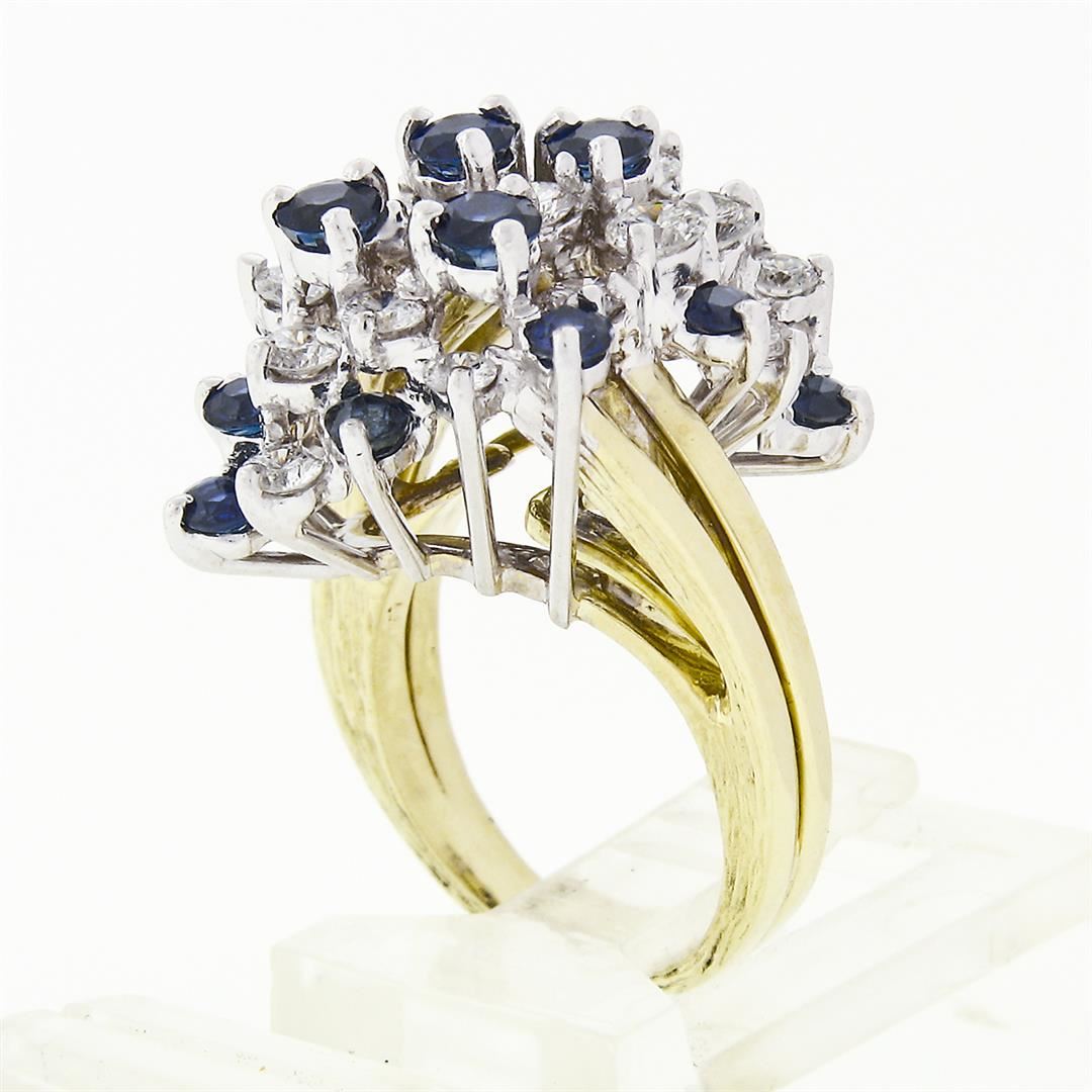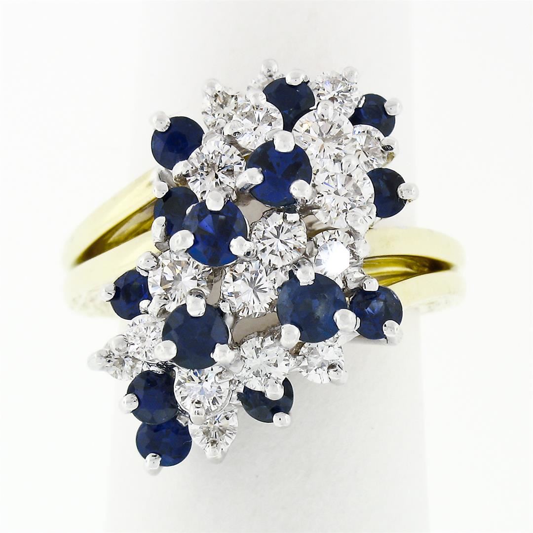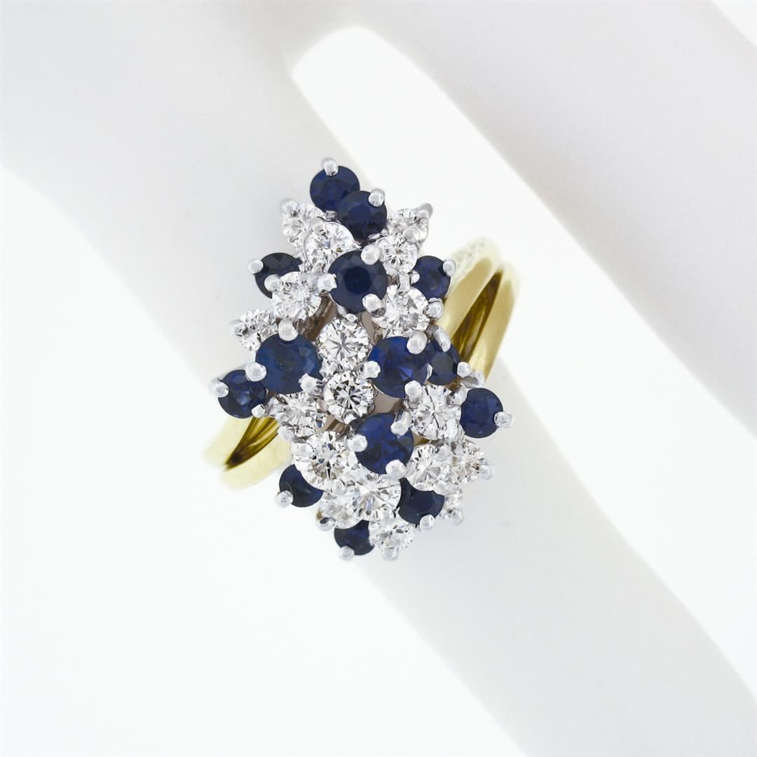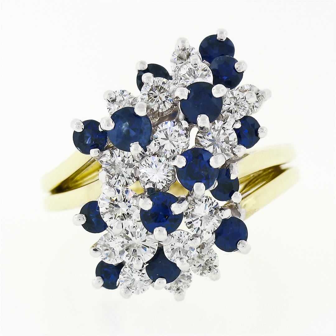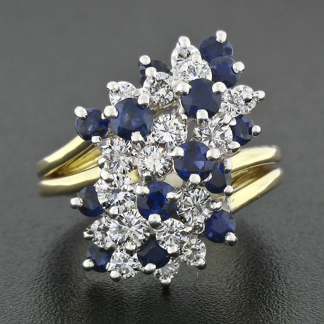A vintage solid 18k yellow & white gold tiered cluster ring, with 18 round brilliant cut natural diamonds (F/G - VS1/VS2; 1.20ctw), and 14 round brilliant cut natural sapphires (1.0ctw ). The ring is size 3.5, weighs a total of 9.91 grams, and measures 16mm wide.
