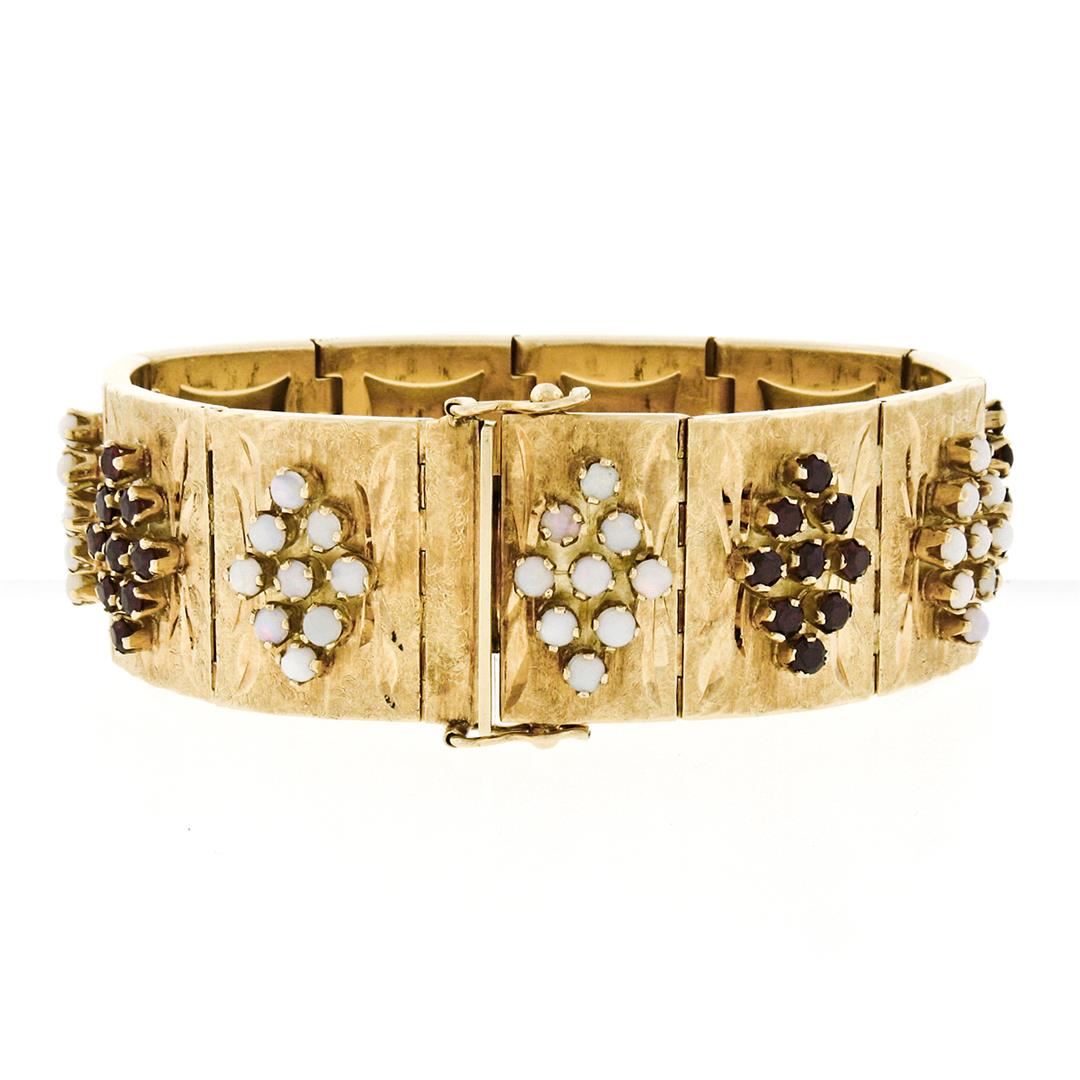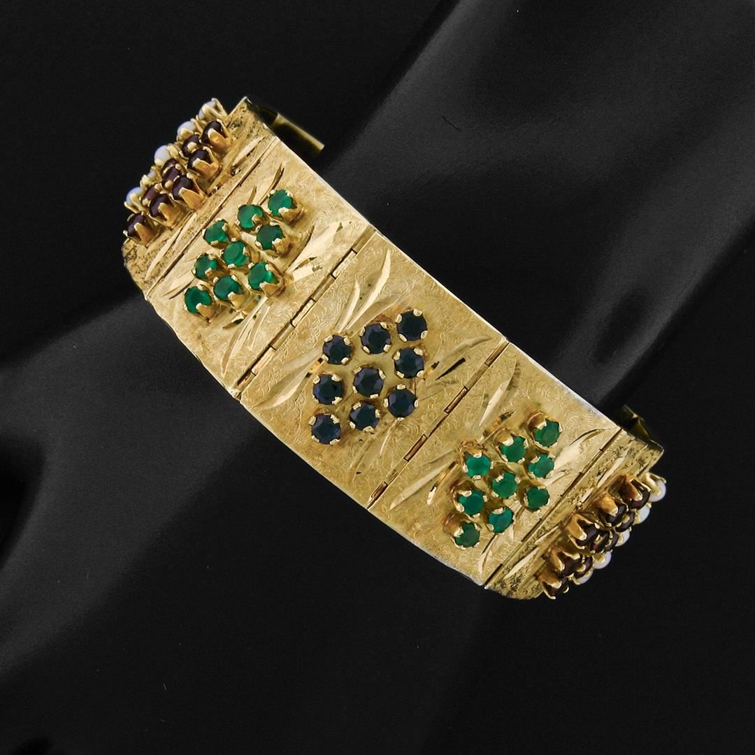 A vinateg solid 18k yellow gold wide bracelet, with 36 round cabochon cut natural opals (2.9mm - 3.0mm), and 36 round cut natural garnets (3.0mm - 4.68ctw), with 18 round cut natural emeralds (3.0mm - 2.16ctw), and 9 round cut natural sapphires ( 3.0mm - 4.5ctw). It weighs a total of 75.72 grams, measures 23.1mm wide, and measures 7 inches in length.