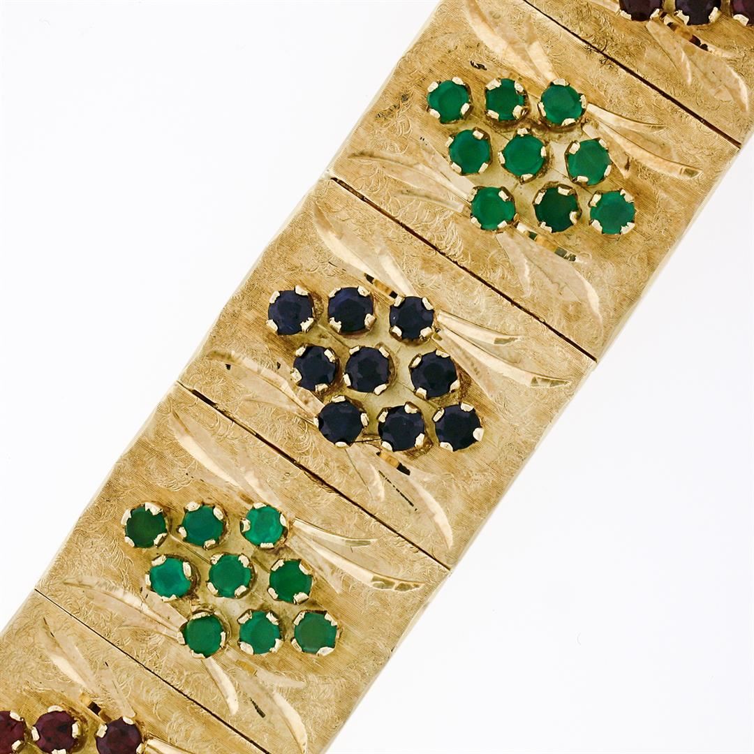 A vinateg solid 18k yellow gold wide bracelet, with 36 round cabochon cut natural opals (2.9mm - 3.0mm), and 36 round cut natural garnets (3.0mm - 4.68ctw), with 18 round cut natural emeralds (3.0mm - 2.16ctw), and 9 round cut natural sapphires ( 3.0mm - 4.5ctw). It weighs a total of 75.72 grams, measures 23.1mm wide, and measures 7 inches in length.