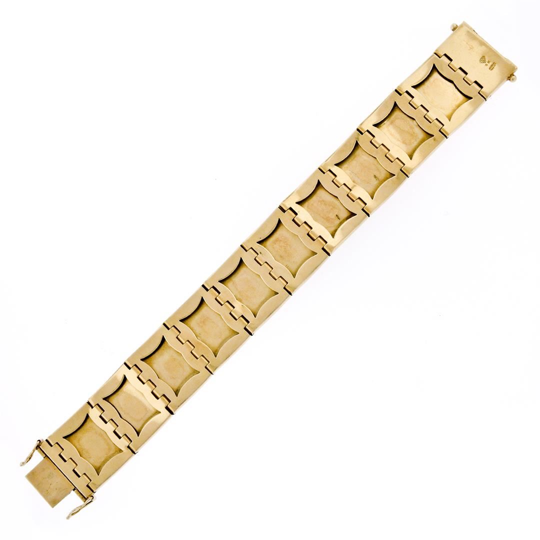 A vinateg solid 18k yellow gold wide bracelet, with 36 round cabochon cut natural opals (2.9mm - 3.0mm), and 36 round cut natural garnets (3.0mm - 4.68ctw), with 18 round cut natural emeralds (3.0mm - 2.16ctw), and 9 round cut natural sapphires ( 3.0mm - 4.5ctw). It weighs a total of 75.72 grams, measures 23.1mm wide, and measures 7 inches in length.