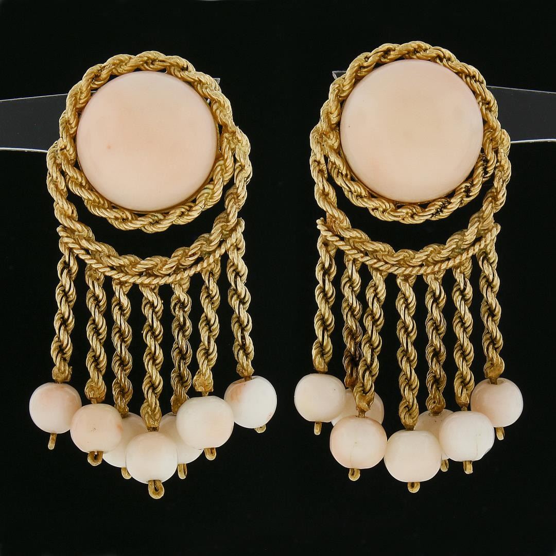 A vintage solid 18k yellow gold dangle earrings, with 2 button shape natural corals (14.5mm each), and 14 round bead shape natural corals ( 5.4mm to 5.9mm each). The earrings measure approximately 45.60x20.60mm and weigh a total of 22.49 grams.