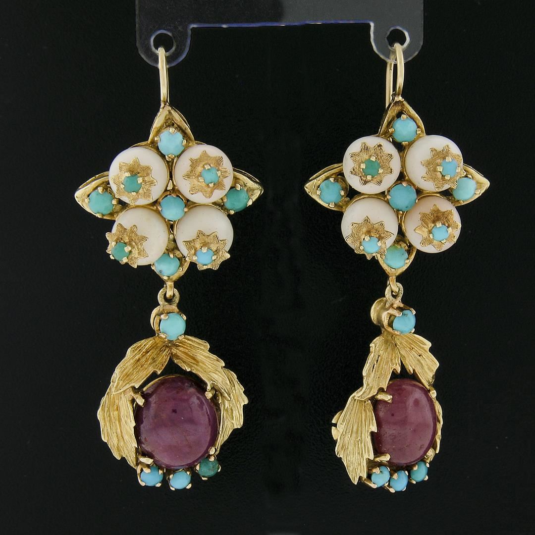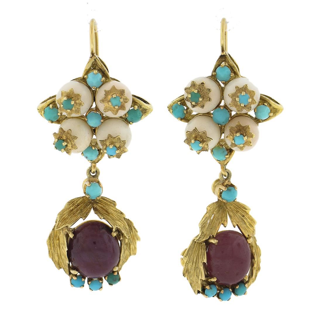 A vintage solid 18k yellow gold drop dangle earrings, with 2 oval cabochon cut natural rubies (9.9x8.4mm ), 8 bead shape natrual corals (6.1mm), and 26 round bead shape natural turquoise (1.9mm to 2.8mm). The earrings measure approximately 50.1x20.1mm and weigh a total of 19.40 grams.