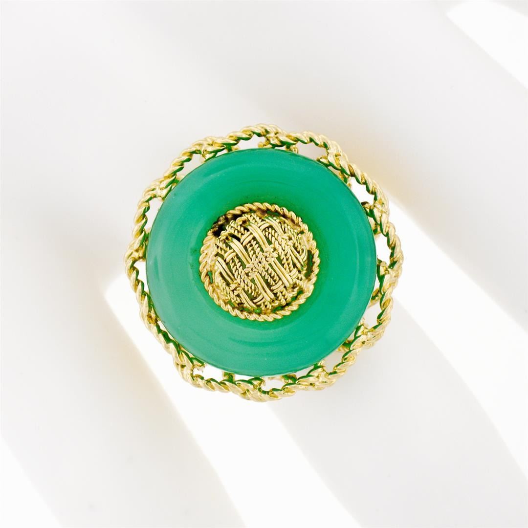 A vintage solid 18k yellow gold platter ring, with 1 circle cabochon shape natural jade (18.3mm). The ring is size 8.0, weighs a total of 11.32 grams, and measures 22.5mm in diameter.