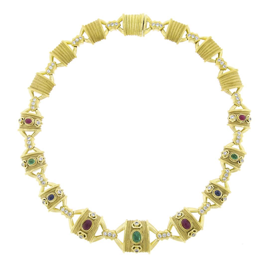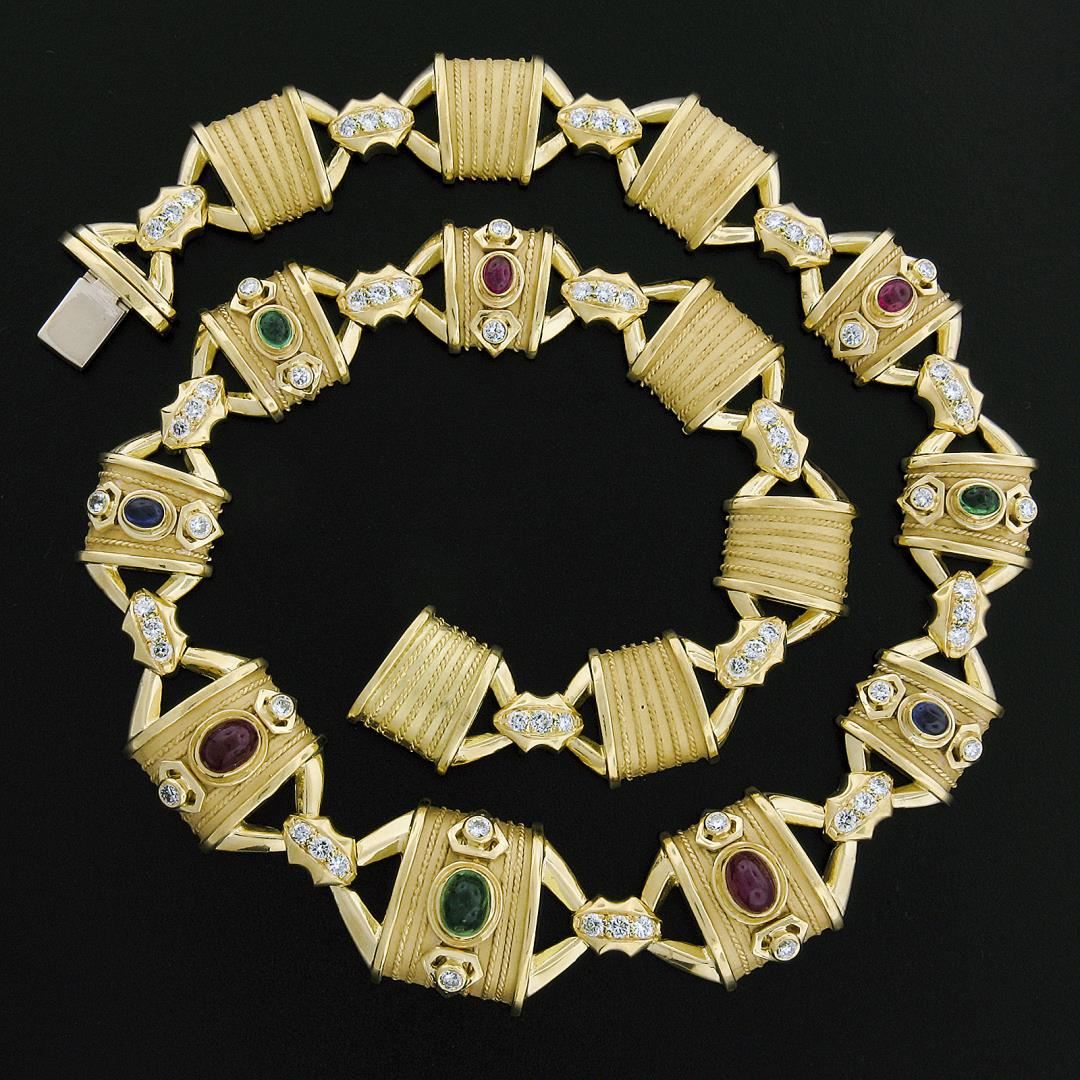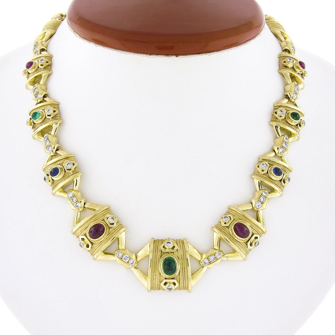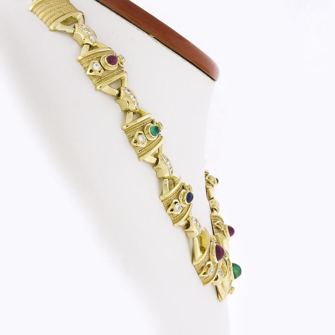 A vintage solid 18k yellow gold link necklace, with 58 round brilliant cut natural diamonds (F/G - VS1/VS2 ; 3.00ctw), 3 oval cabochon cut natural emeralds (2.00ctw ), 2 oval cabochon cut natural sapphires (0.80ctw), and 4 oval cabochon cut natural rubies (2.85ctw). It weighs a total of 117.54 grams, measures 20.2mm wide, and measures 16 inches in length.