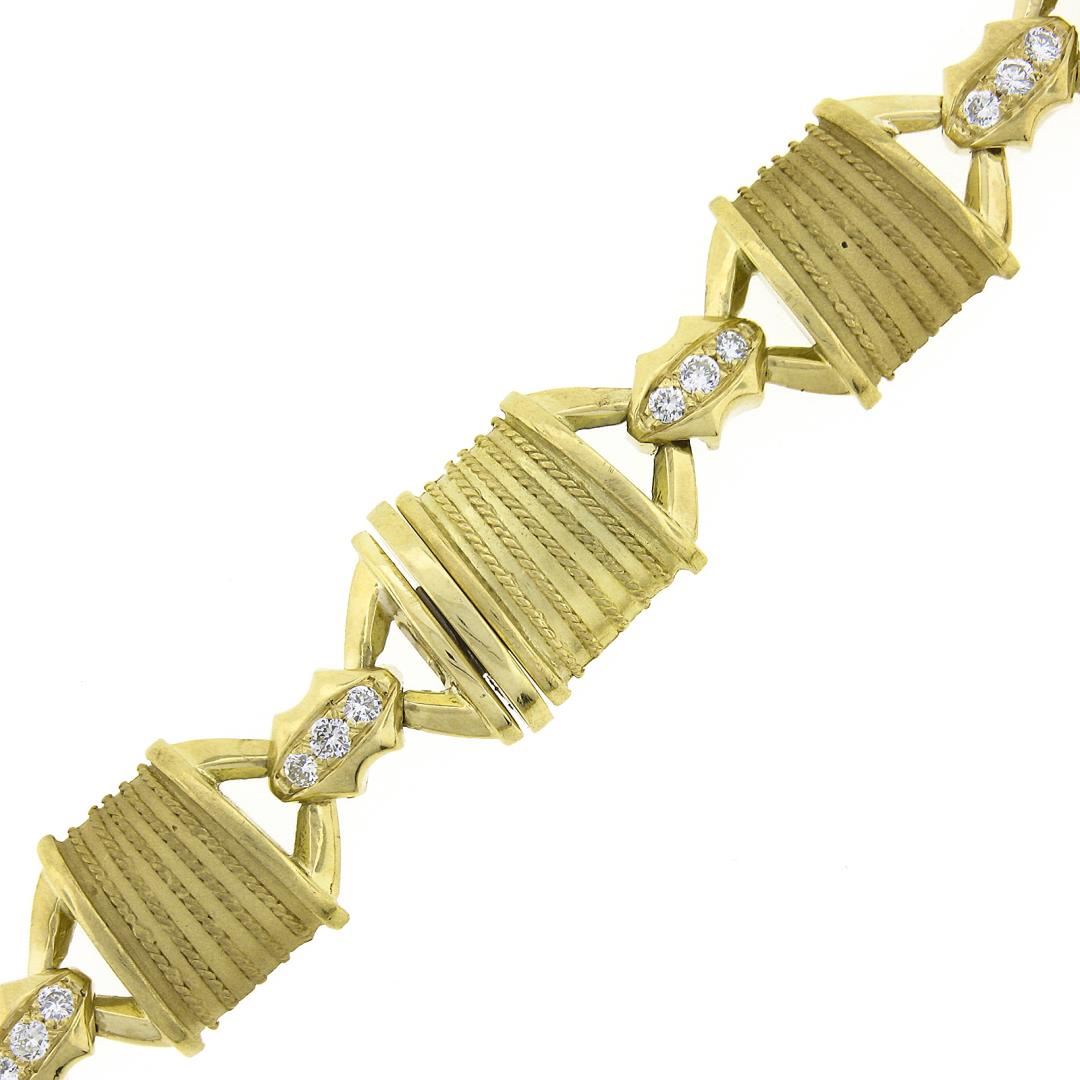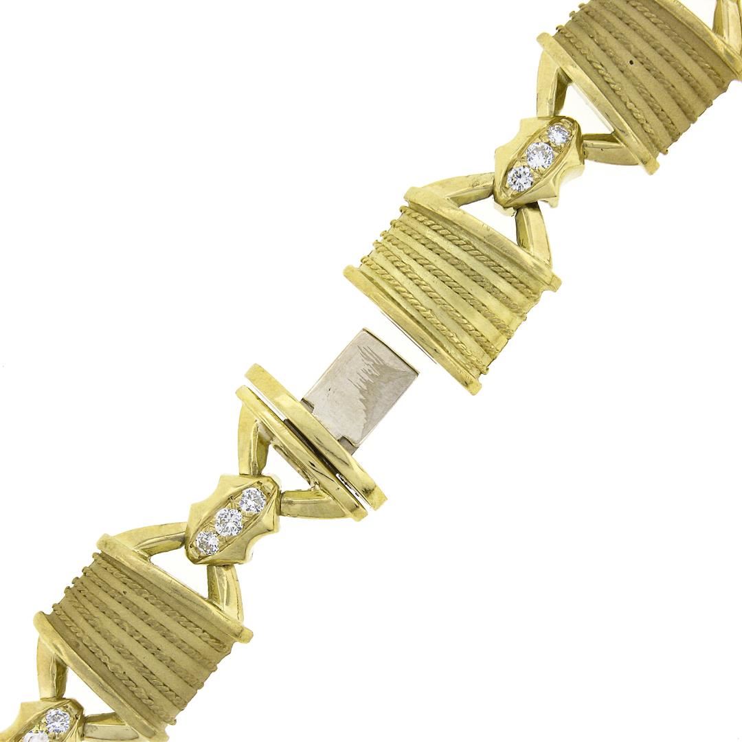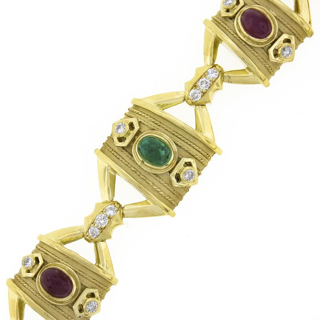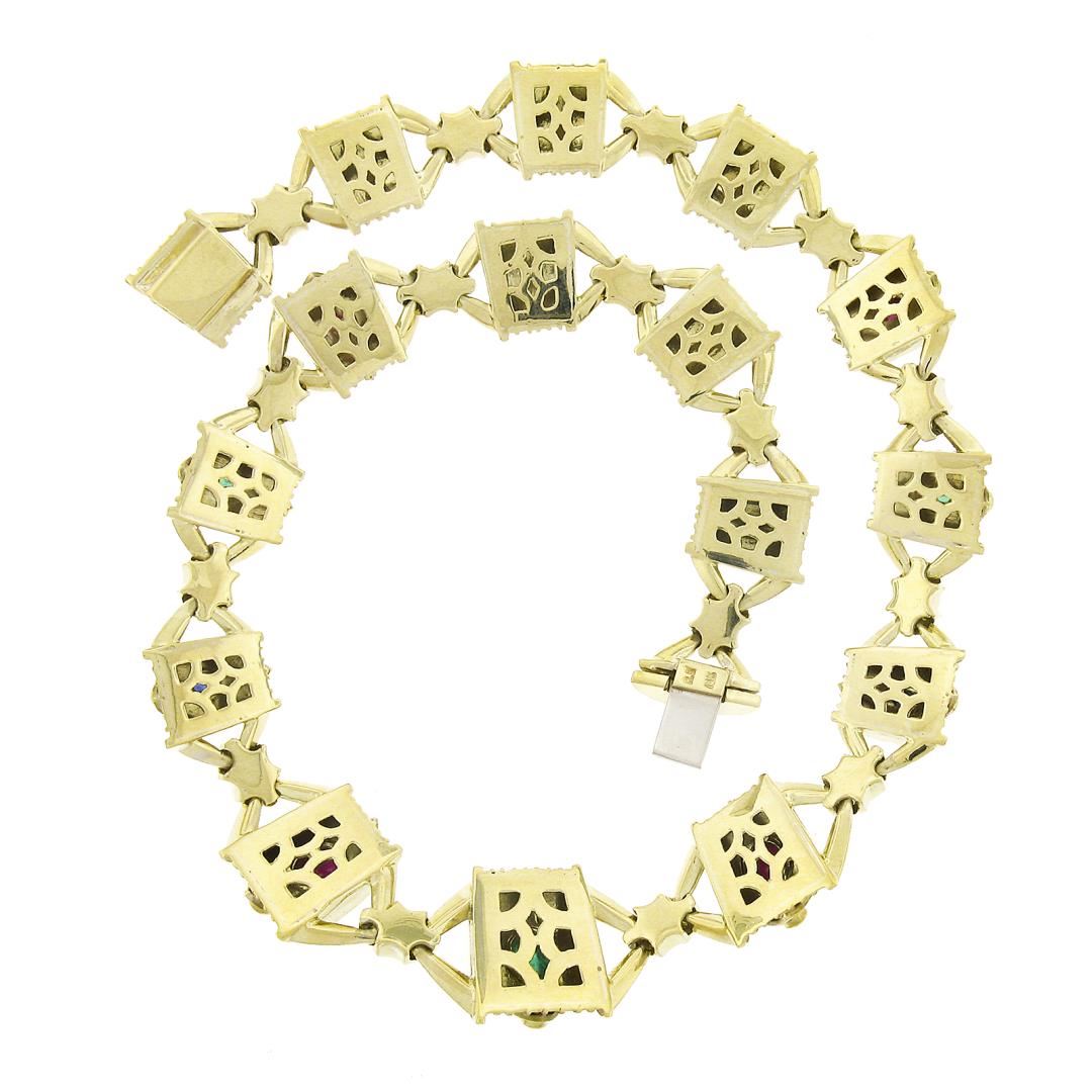 A vintage solid 18k yellow gold link necklace, with 58 round brilliant cut natural diamonds (F/G - VS1/VS2 ; 3.00ctw), 3 oval cabochon cut natural emeralds (2.00ctw ), 2 oval cabochon cut natural sapphires (0.80ctw), and 4 oval cabochon cut natural rubies (2.85ctw). It weighs a total of 117.54 grams, measures 20.2mm wide, and measures 16 inches in length.