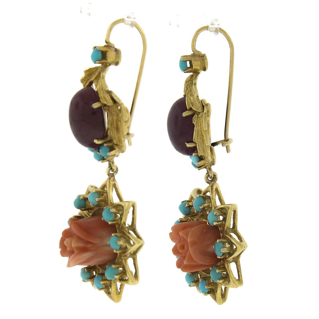 A vintage solid 18k yellow gold drop dangle earrings, with 2 carved flower shape natural corals (9.6mm ), 2 oval cabochon cut natrual rubies (11.4x8.7mm), and 26 round bead shape natural turquoise (2.4mm to 3mm). The earrings measure approximately 52.4x22.5mm and weigh a total of 21.37 grams.
