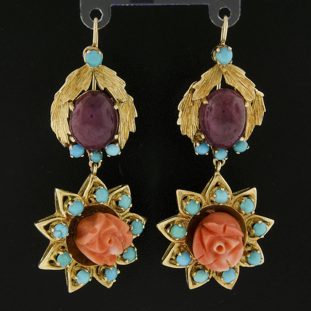 A vintage solid 18k yellow gold drop dangle earrings, with 2 carved flower shape natural corals (9.6mm ), 2 oval cabochon cut natrual rubies (11.4x8.7mm), and 26 round bead shape natural turquoise (2.4mm to 3mm). The earrings measure approximately 52.4x22.5mm and weigh a total of 21.37 grams.