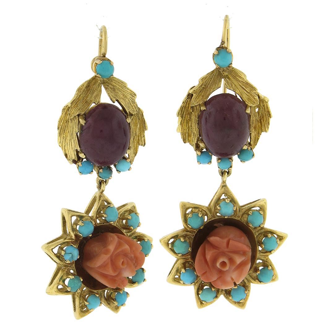 A vintage solid 18k yellow gold drop dangle earrings, with 2 carved flower shape natural corals (9.6mm ), 2 oval cabochon cut natrual rubies (11.4x8.7mm), and 26 round bead shape natural turquoise (2.4mm to 3mm). The earrings measure approximately 52.4x22.5mm and weigh a total of 21.37 grams.