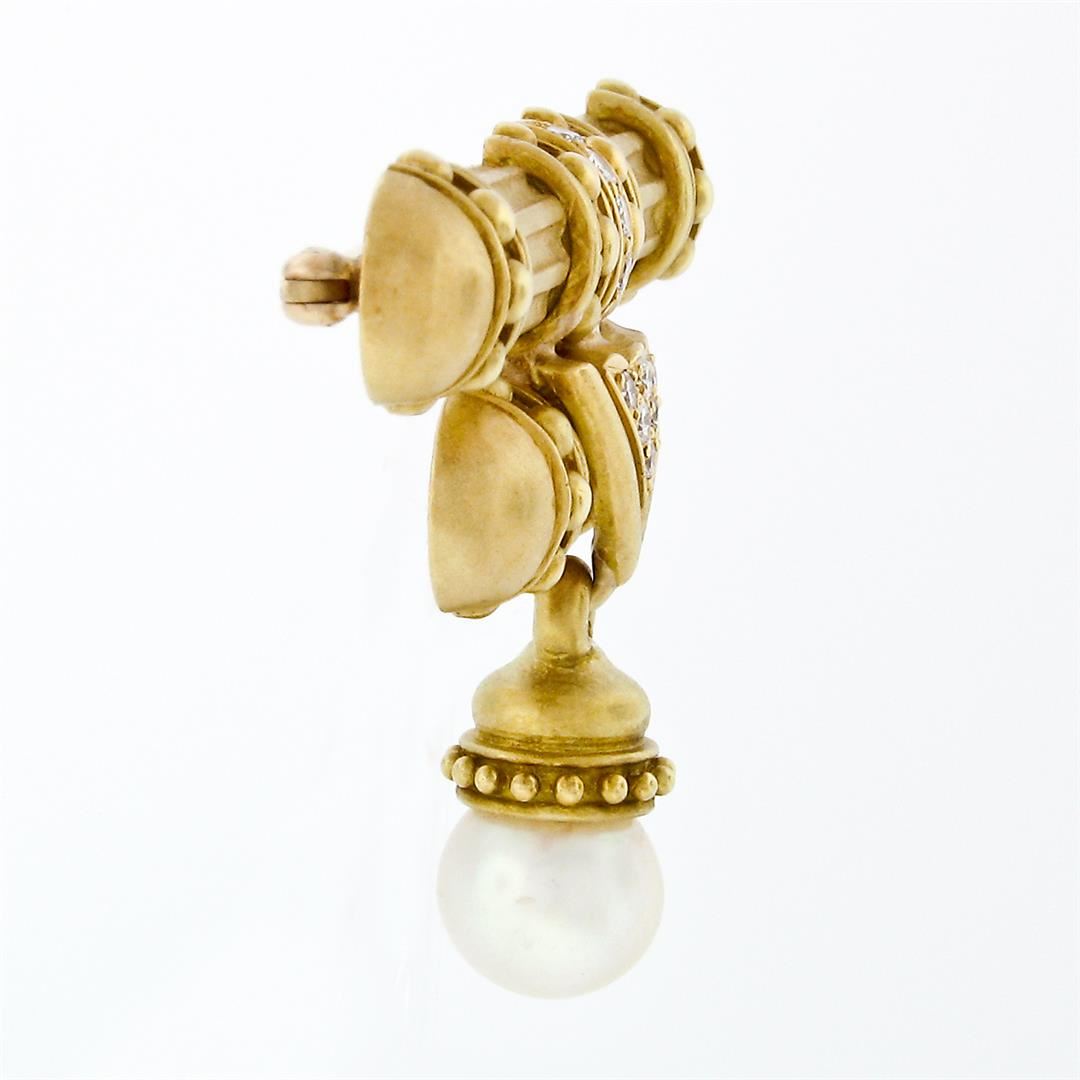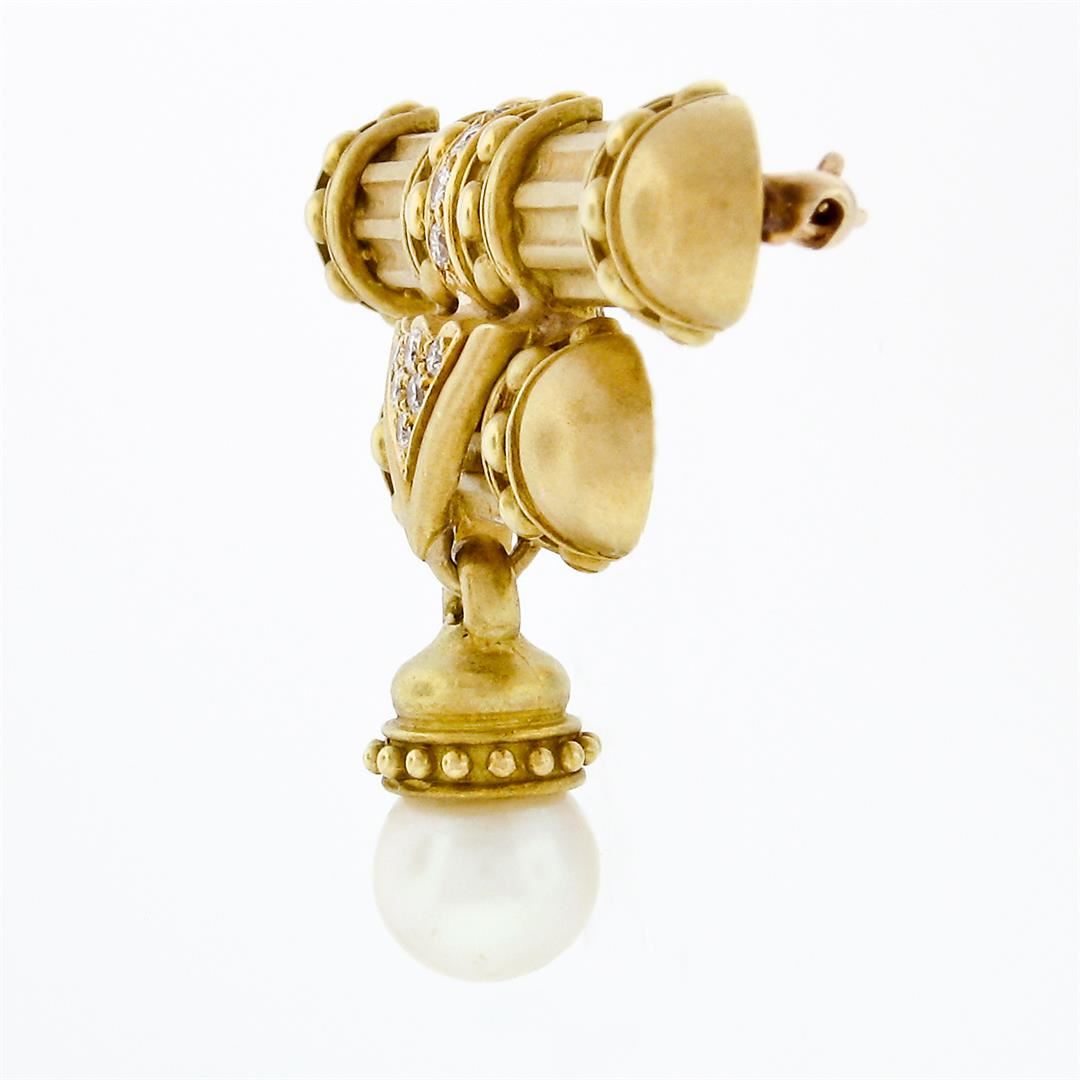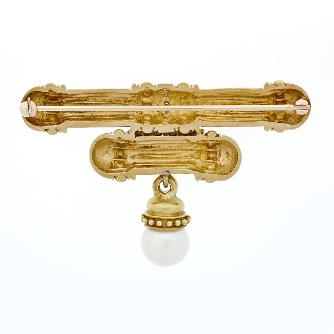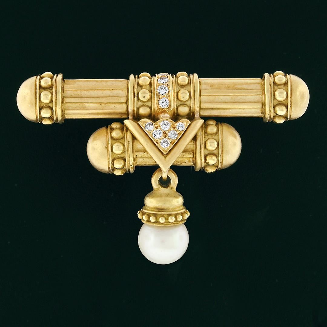 A solid 18k yellow gold dual bar pin brooch, with 10 round brilliant cut natural diamonds (D/E - VVS2 ; 0.30ctw), and 1 round bead shape cultured pearl (9.1mm ). Measures 19.9x53.1mm and weighs a total of 20.20 grams.