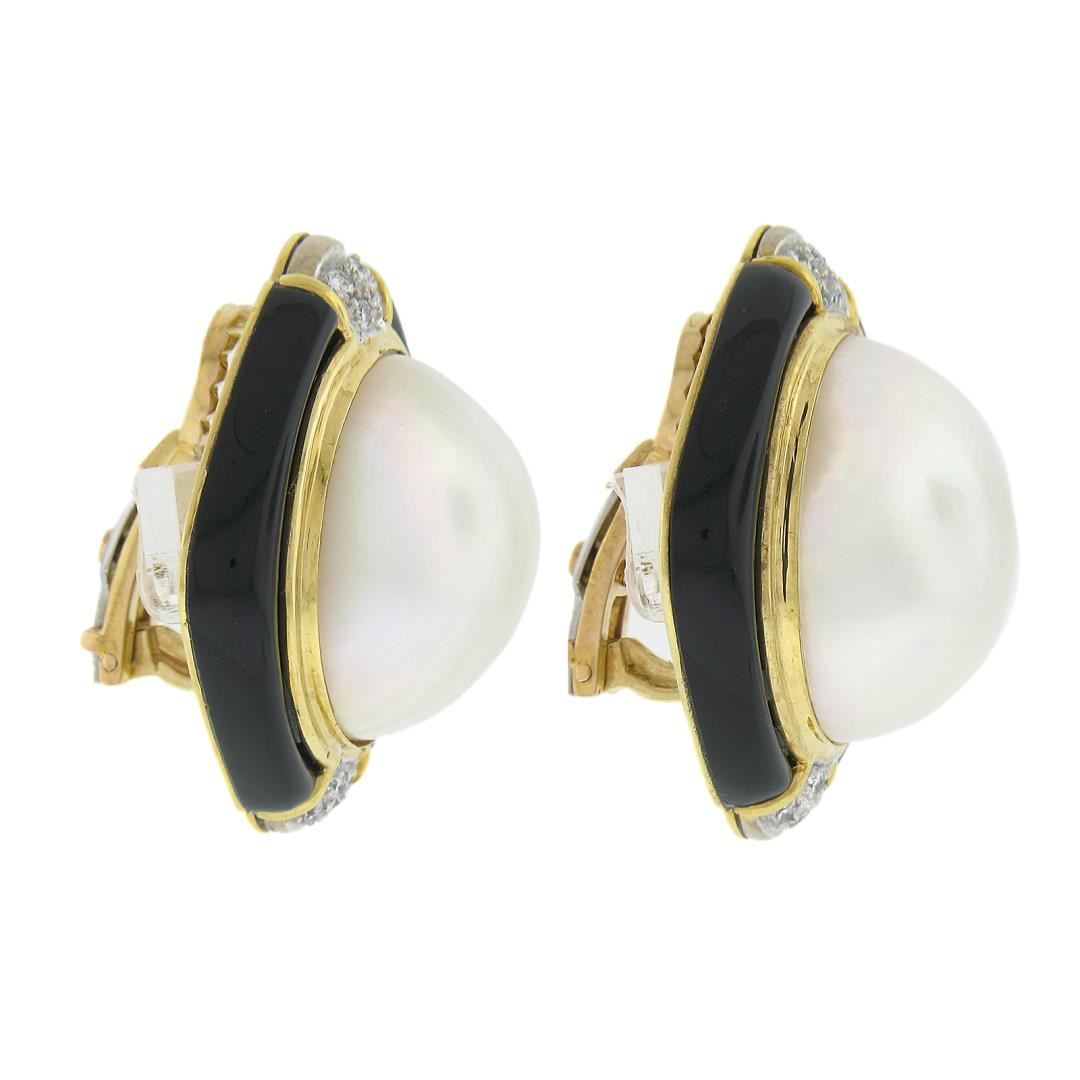 A vintage solid 18k yellow gold button earrings, with 2 round shape cultured mabe pearls (19.6mm each), 20 round cut natural diamonds (G/H - VS1-SI1 ; 0.20ctw), and 4 custom cut natural black onyx.The earrings measure approximately 30.1mm in diameter and weigh a total of 34.05 grams.