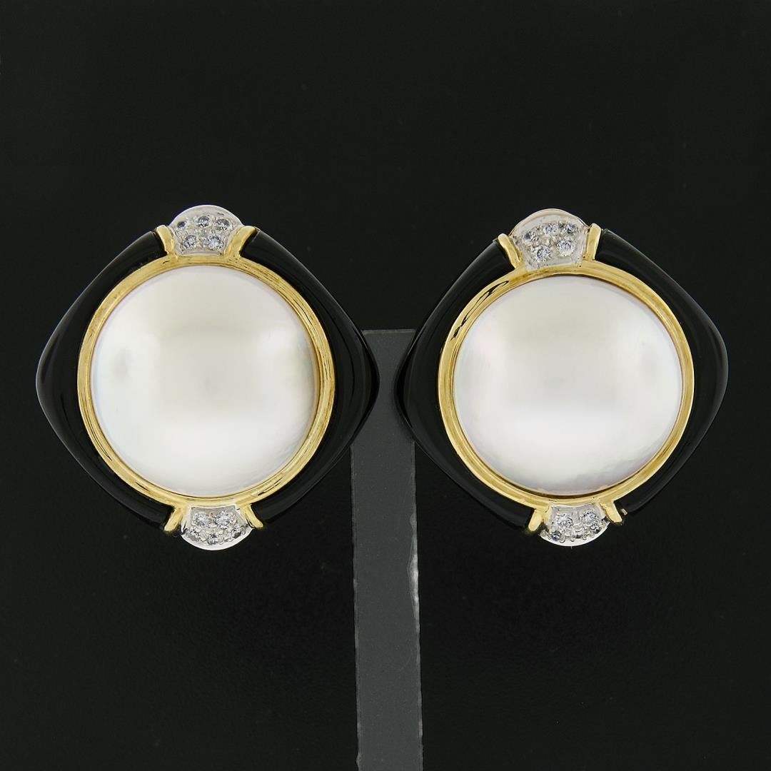 A vintage solid 18k yellow gold button earrings, with 2 round shape cultured mabe pearls (19.6mm each), 20 round cut natural diamonds (G/H - VS1-SI1 ; 0.20ctw), and 4 custom cut natural black onyx.The earrings measure approximately 30.1mm in diameter and weigh a total of 34.05 grams.
