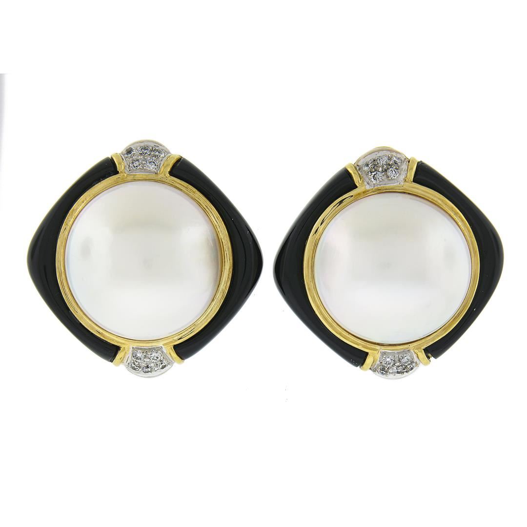 Vintage 18K Gold Large Mabe Pearl Diamond & Black Onyx Frame Button Earrings