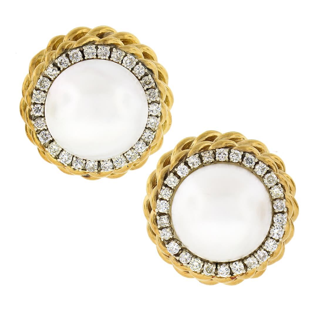 A vintage solid 18k yellow gold button earrings, with 2 large round cultured mabe pearls (15-15.4mm each), surrounded with a halo of 52 round cut natrual diamonds (H/I - VS2 ; 1.56ctw). The earrings measure approximately 23.20mm in diameter and weigh a total of 23.02 grams.