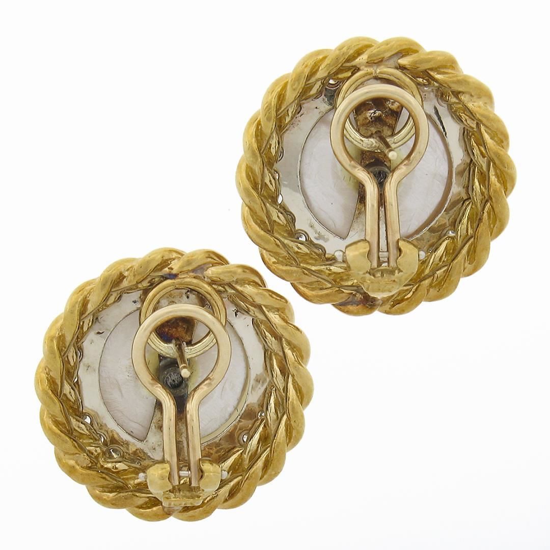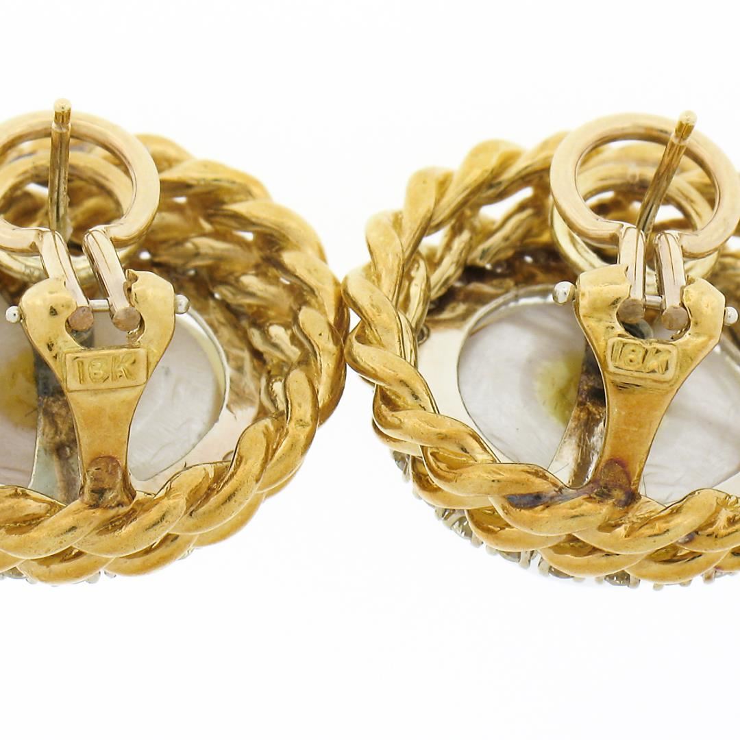 A vintage solid 18k yellow gold button earrings, with 2 large round cultured mabe pearls (15-15.4mm each), surrounded with a halo of 52 round cut natrual diamonds (H/I - VS2 ; 1.56ctw). The earrings measure approximately 23.20mm in diameter and weigh a total of 23.02 grams.