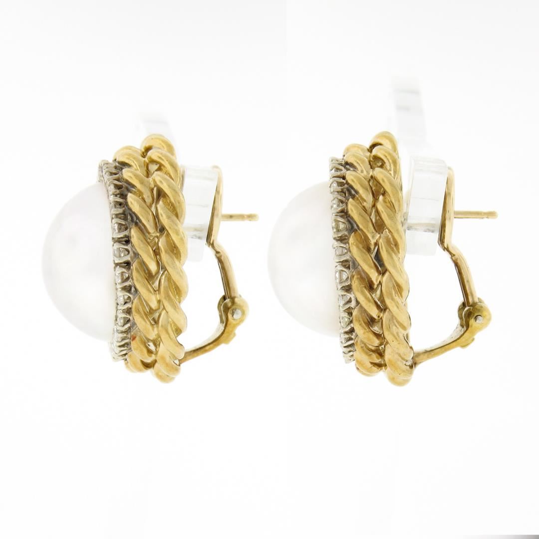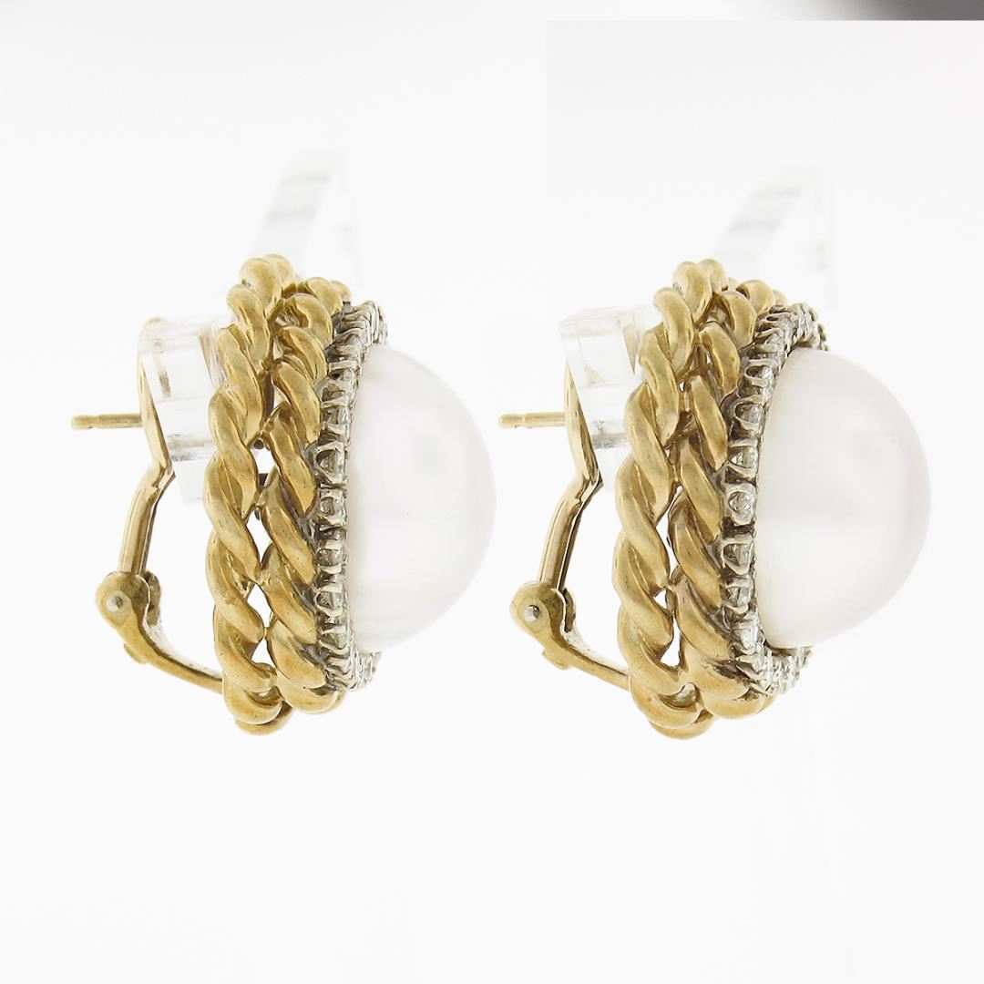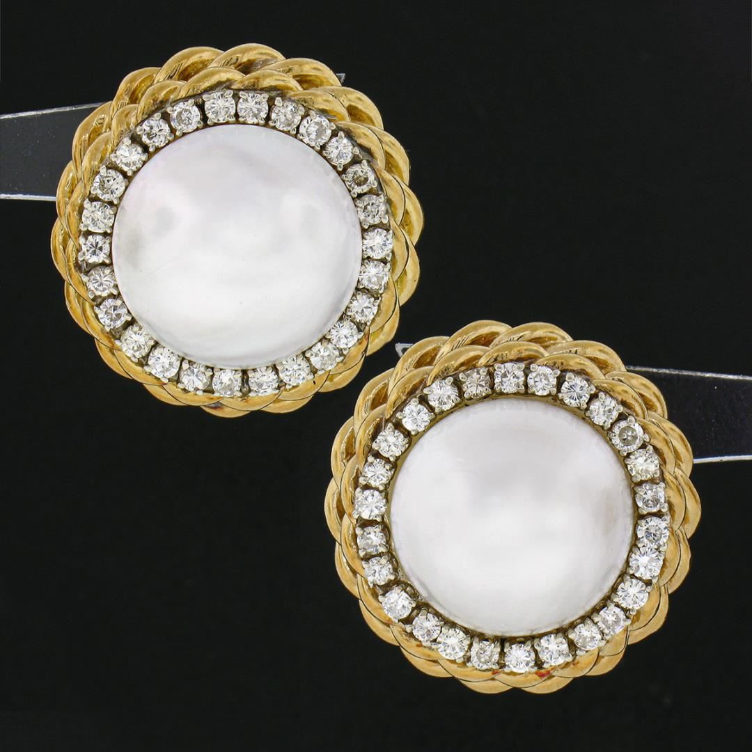 A vintage solid 18k yellow gold button earrings, with 2 large round cultured mabe pearls (15-15.4mm each), surrounded with a halo of 52 round cut natrual diamonds (H/I - VS2 ; 1.56ctw). The earrings measure approximately 23.20mm in diameter and weigh a total of 23.02 grams.