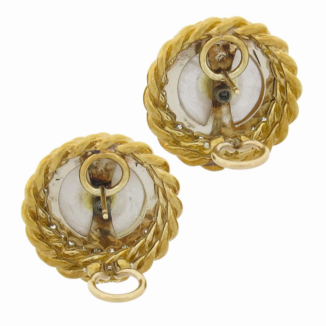 A vintage solid 18k yellow gold button earrings, with 2 large round cultured mabe pearls (15-15.4mm each), surrounded with a halo of 52 round cut natrual diamonds (H/I - VS2 ; 1.56ctw). The earrings measure approximately 23.20mm in diameter and weigh a total of 23.02 grams.