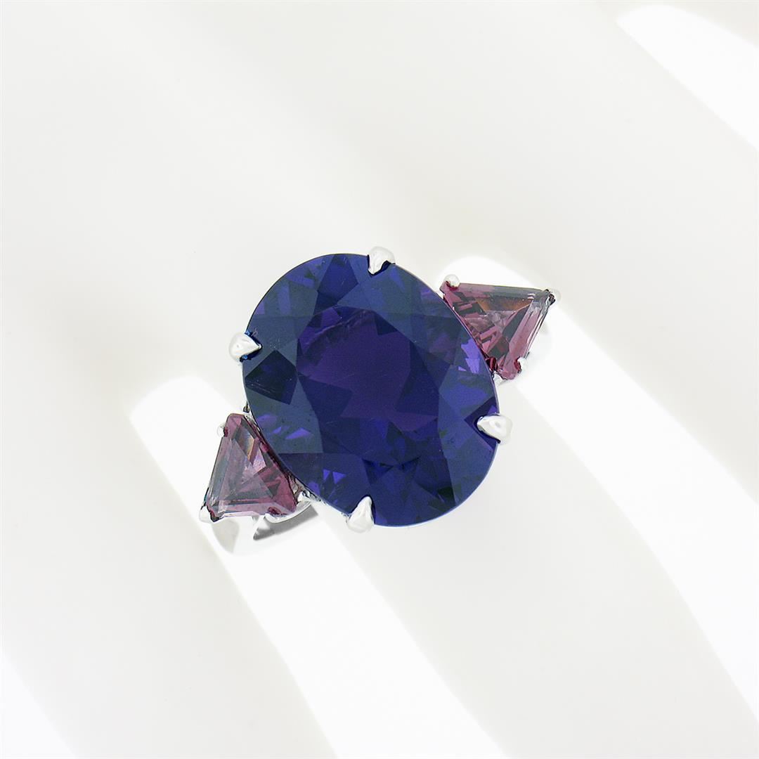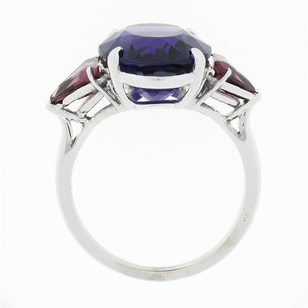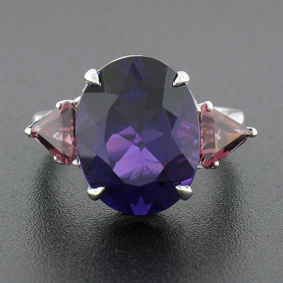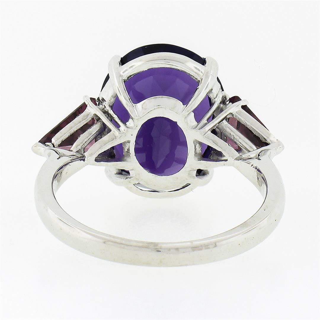 A solid 18k white gold ring, with 1 oval brilliant cut natural amethyst (16.3x12.7mm - 9.25ct), and 2 trillion cut natural garnets (1.80ctw). The ring is size 9.5, weighs a total of 8.25 grams, and measures 16.30mm wide.